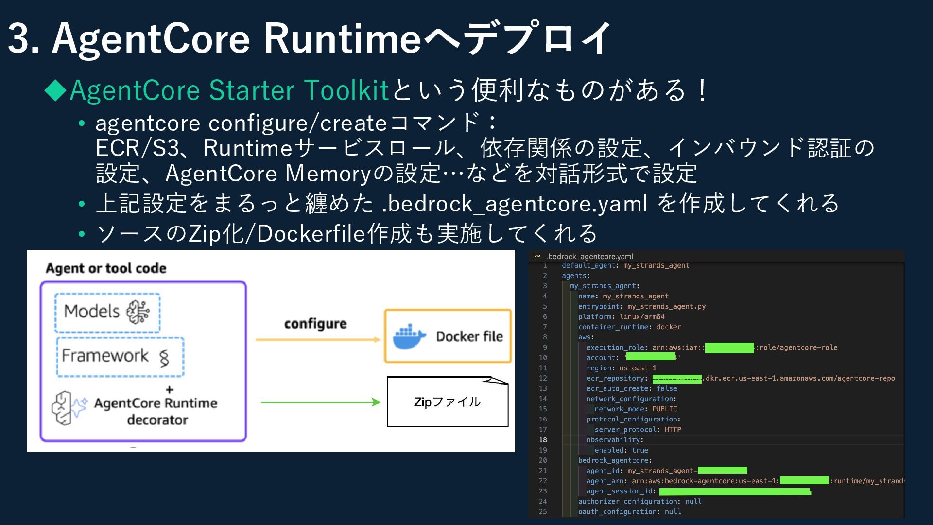 3. AgentCore Runtimeへデプロイ ◆AgentCore Starter Toolkitという便利なものがある! • agentcore configure/createコマンド: ECR/S3、Runtimeサービスロール、依存関係の設定、インバウンド認証の