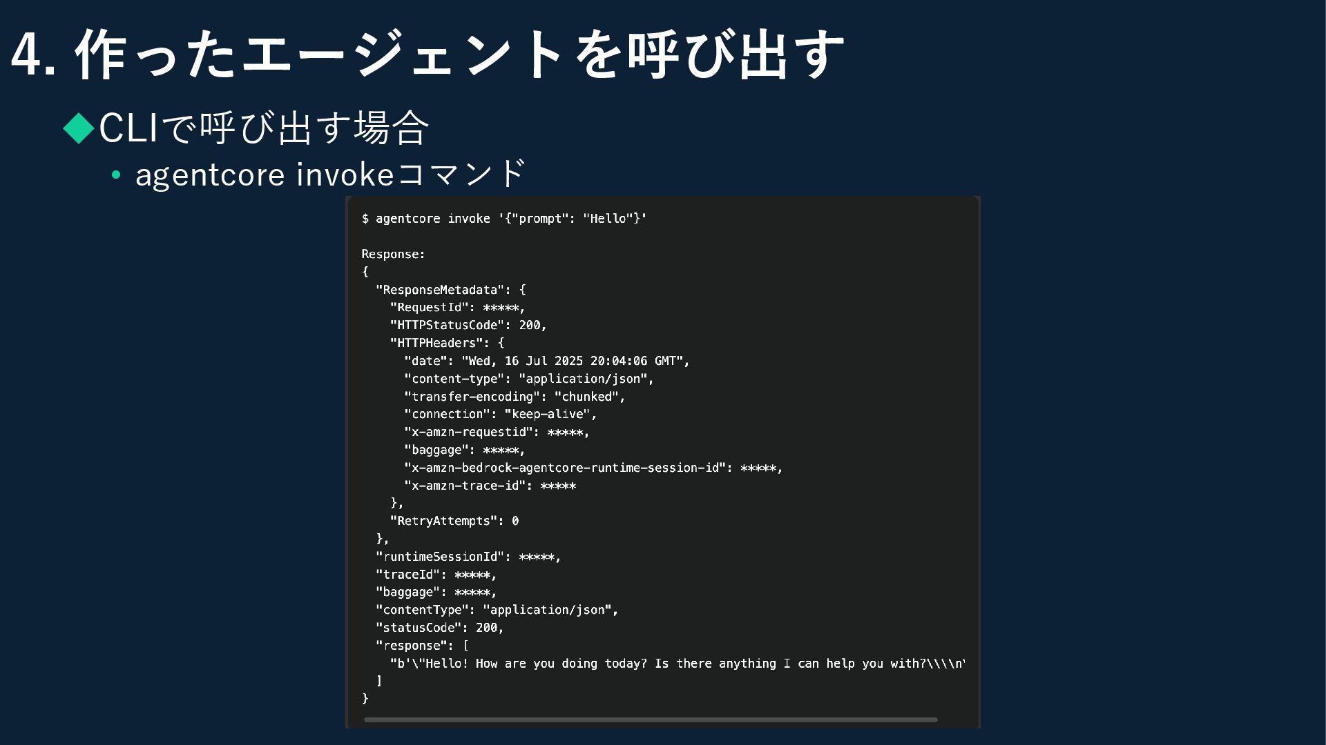 4. 作ったエージェントを呼び出す ◆CLIで呼び出す場合 • agentcore invokeコマンド