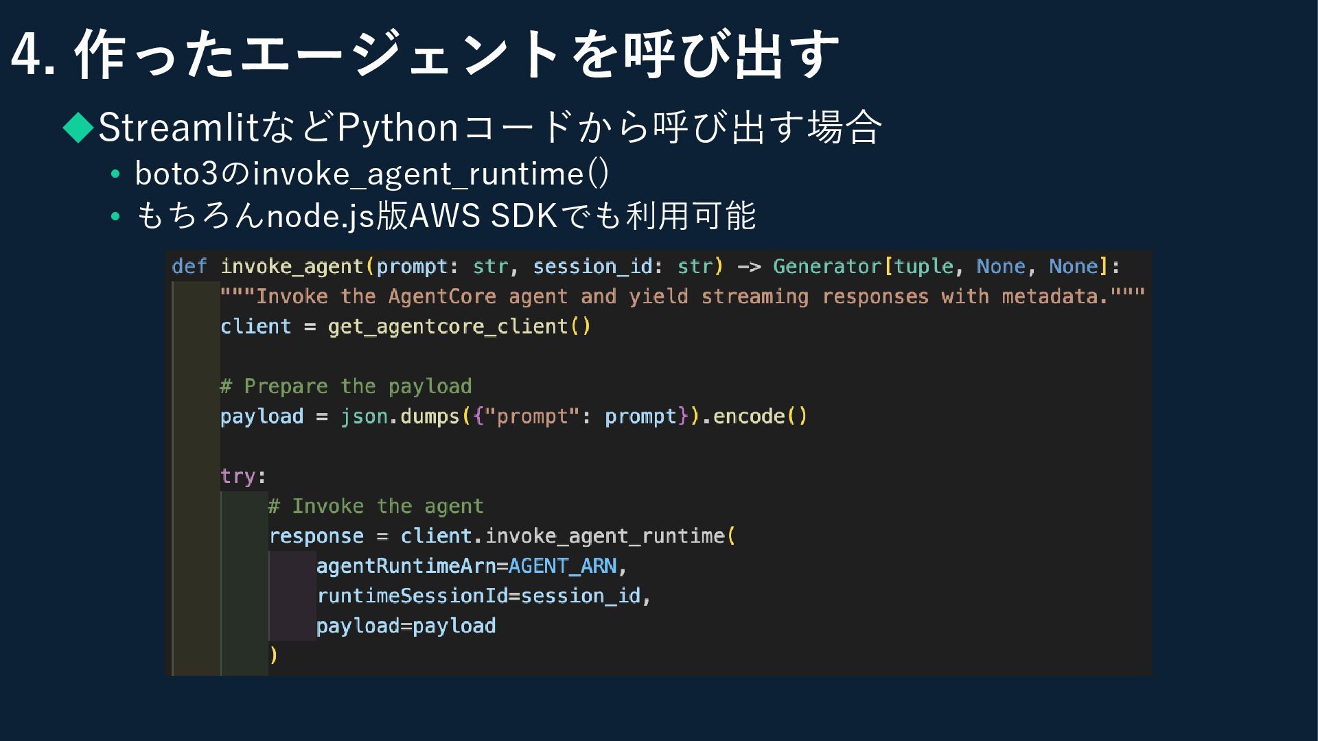 4. 作ったエージェントを呼び出す ◆StreamlitなどPythonコードから呼び出す場合 • boto3のinvoke_agent_runtime() • もちろんnode.js版AWS SDKでも利用可能