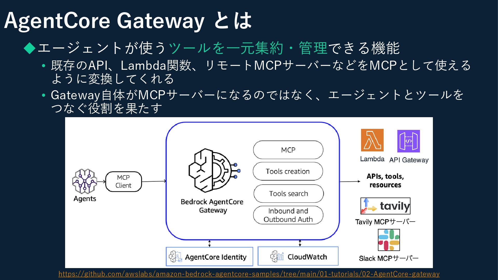 ◆エージェントが使うツールを一元集約・管理できる機能 • 既存のAPI、Lambda関数、リモートMCPサーバーなどをMCPとして使える ように変換してくれる • Gateway自体がMCPサーバーになるのではなく、エージェントとツールを つなぐ役割を果たす AgentCore Gateway とは