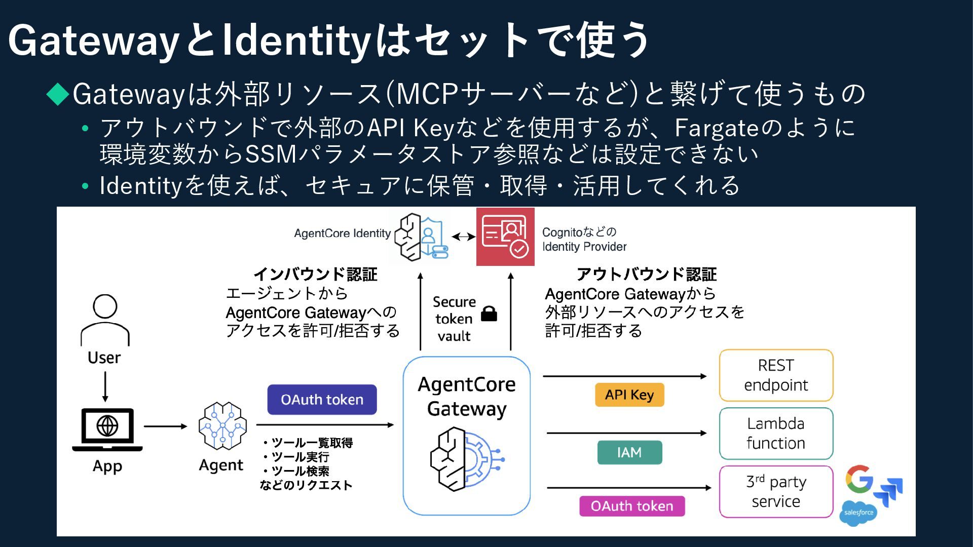 ◆Gatewayは外部リソース(MCPサーバーなど)と繋げて使うもの • アウトバウンドで外部のAPI Keyなどを使用するが、Fargateのように 環境変数からSSMパラメータストア参照などは設定できない • Identityを使えば、セキュアに保管・取得・活用してくれる GatewayとIdentityはセットで使う