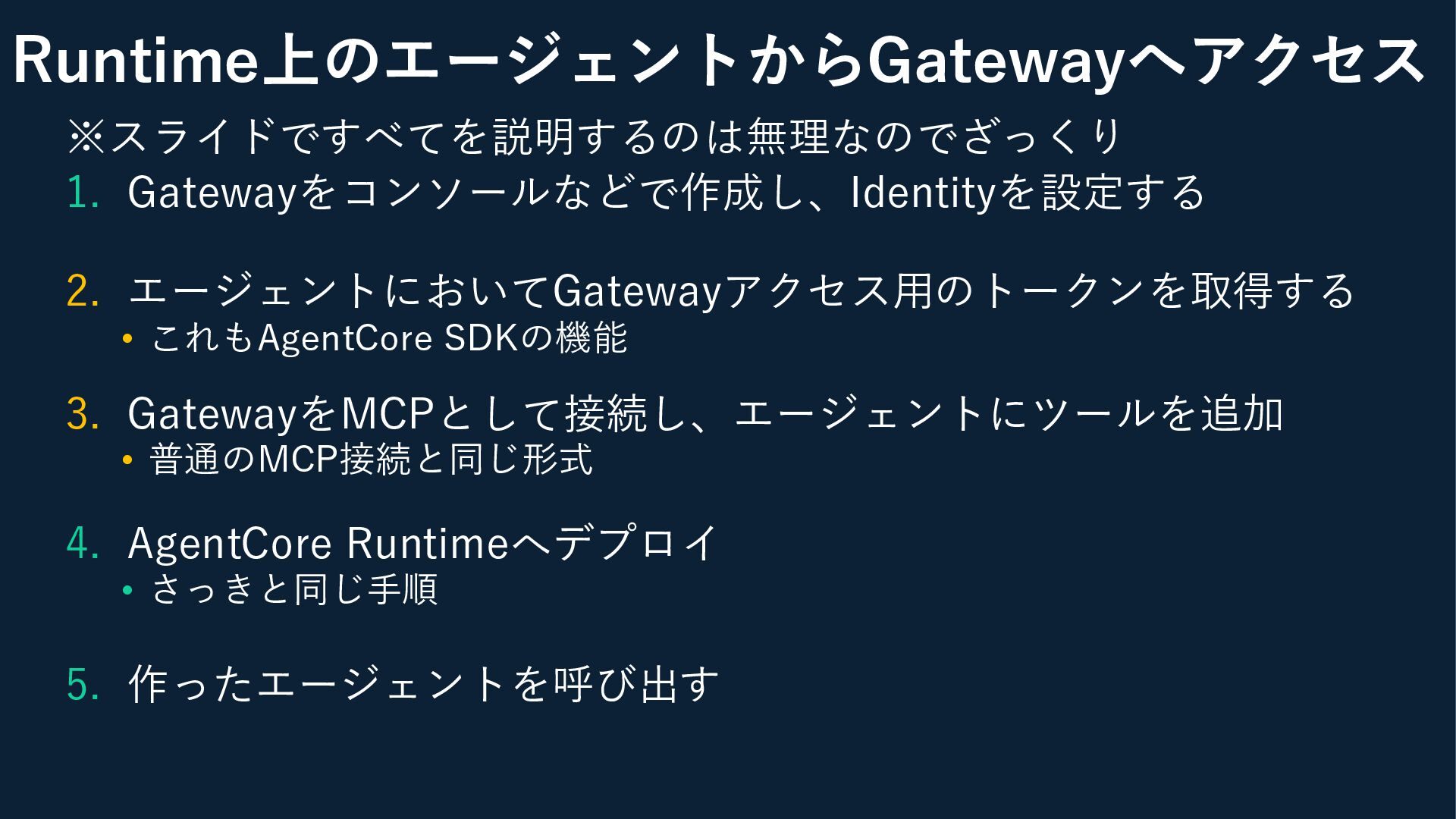 Runtime上のエージェントからGatewayへアクセス ※スライドですべてを説明するのは無理なのでざっくり 1. Gatewayをコンソールなどで作成し、Identityを設定する 2. エージェントにおいてGatewayアクセス用のトークンを取得する • これもAgentCore SDKの機能 3.