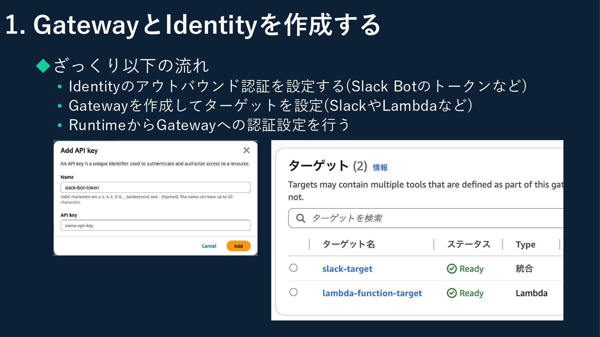 1. GatewayとIdentityを作成する ◆ざっくり以下の流れ • Identityのアウトバウンド認証を設定する(Slack Botのトークンなど) • Gatewayを作成してターゲットを設定(SlackやLambdaなど) • RuntimeからGatewayへの認証設定を行う