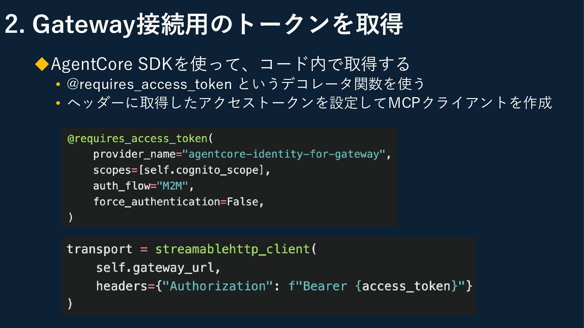 2. Gateway接続用のトークンを取得 ◆AgentCore SDKを使って、コード内で取得する • @requires_access_token というデコレータ関数を使う • ヘッダーに取得したアクセストークンを設定してMCPクライアントを作成