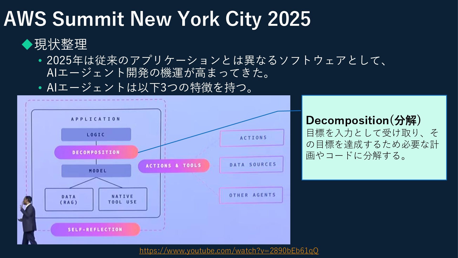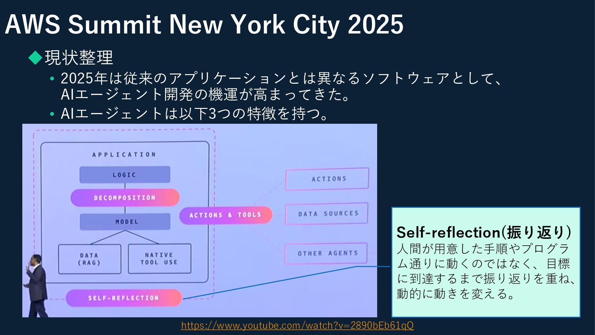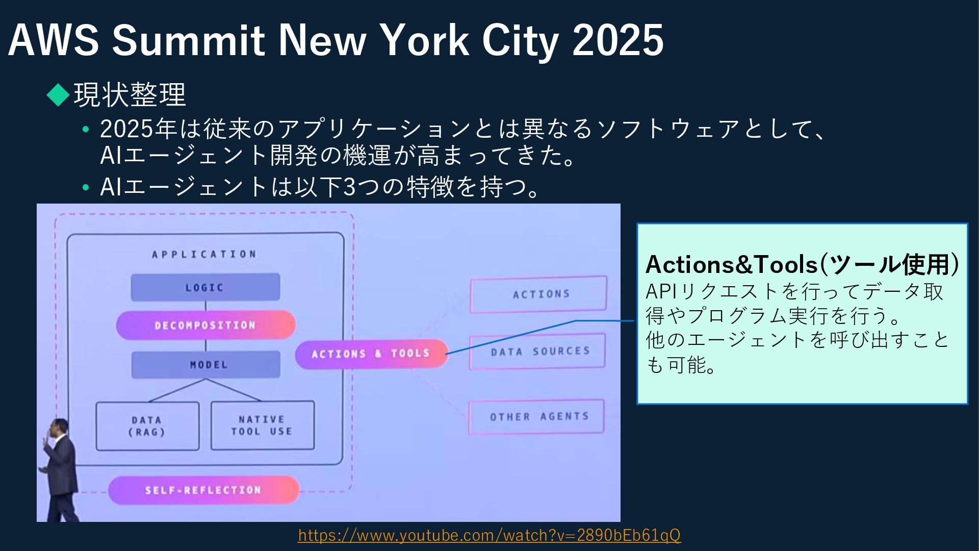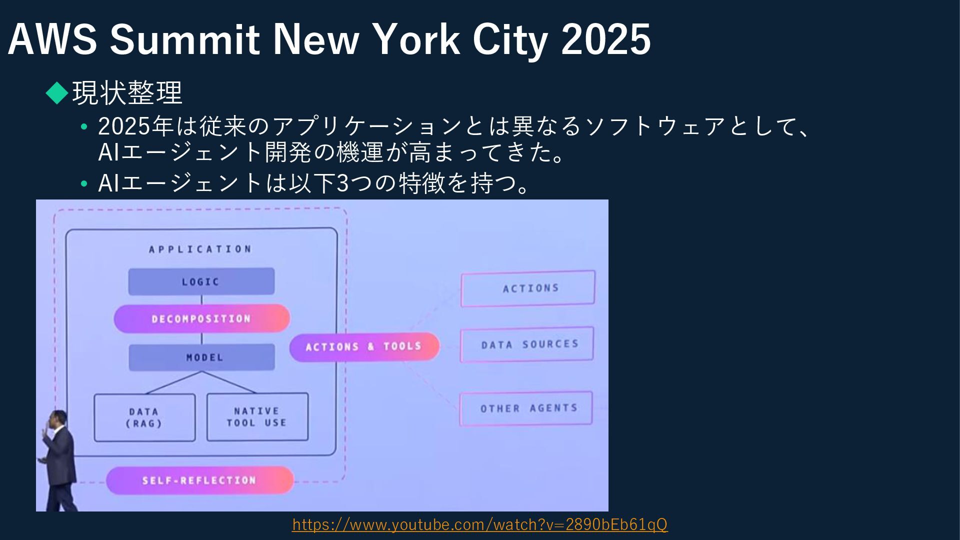 AWS Summit New York City 2025 ◆現状整理 • 2025年は従来のアプリケーションとは異なるソフトウェアとして、 AIエージェント開発の機運が高まってきた。