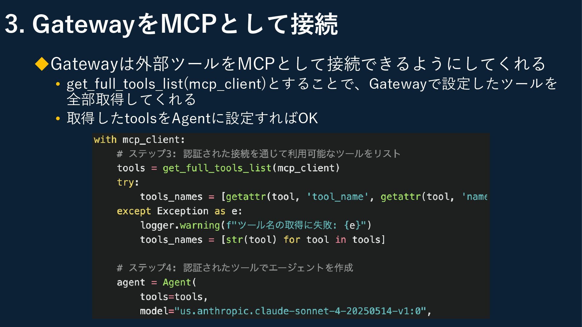 3. GatewayをMCPとして接続 ◆Gatewayは外部ツールをMCPとして接続できるようにしてくれる • get_full_tools_list(mcp_client)とすることで、Gatewayで設定したツールを 全部取得してくれる • 取得したtoolsをAgentに設定すればOK