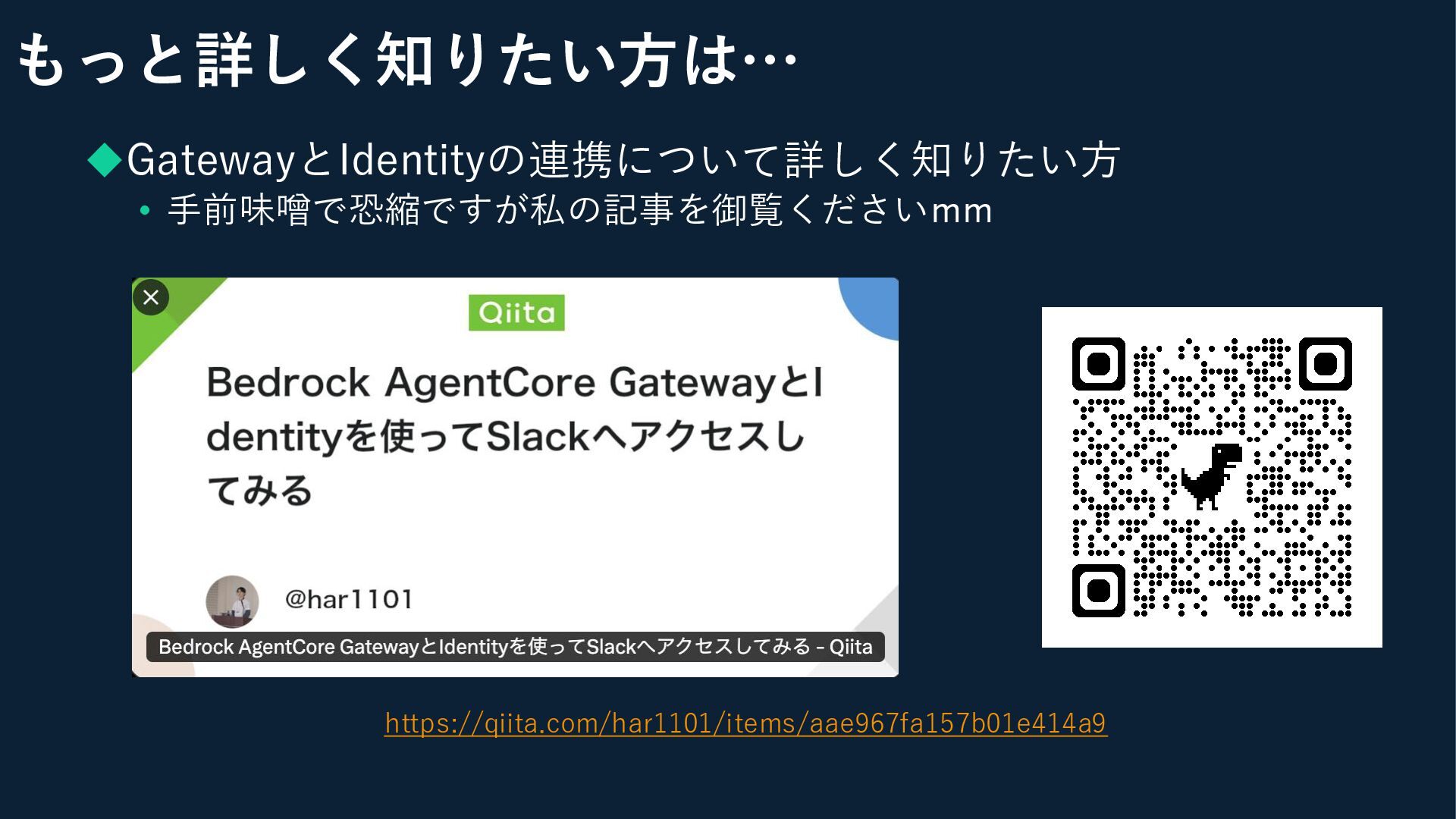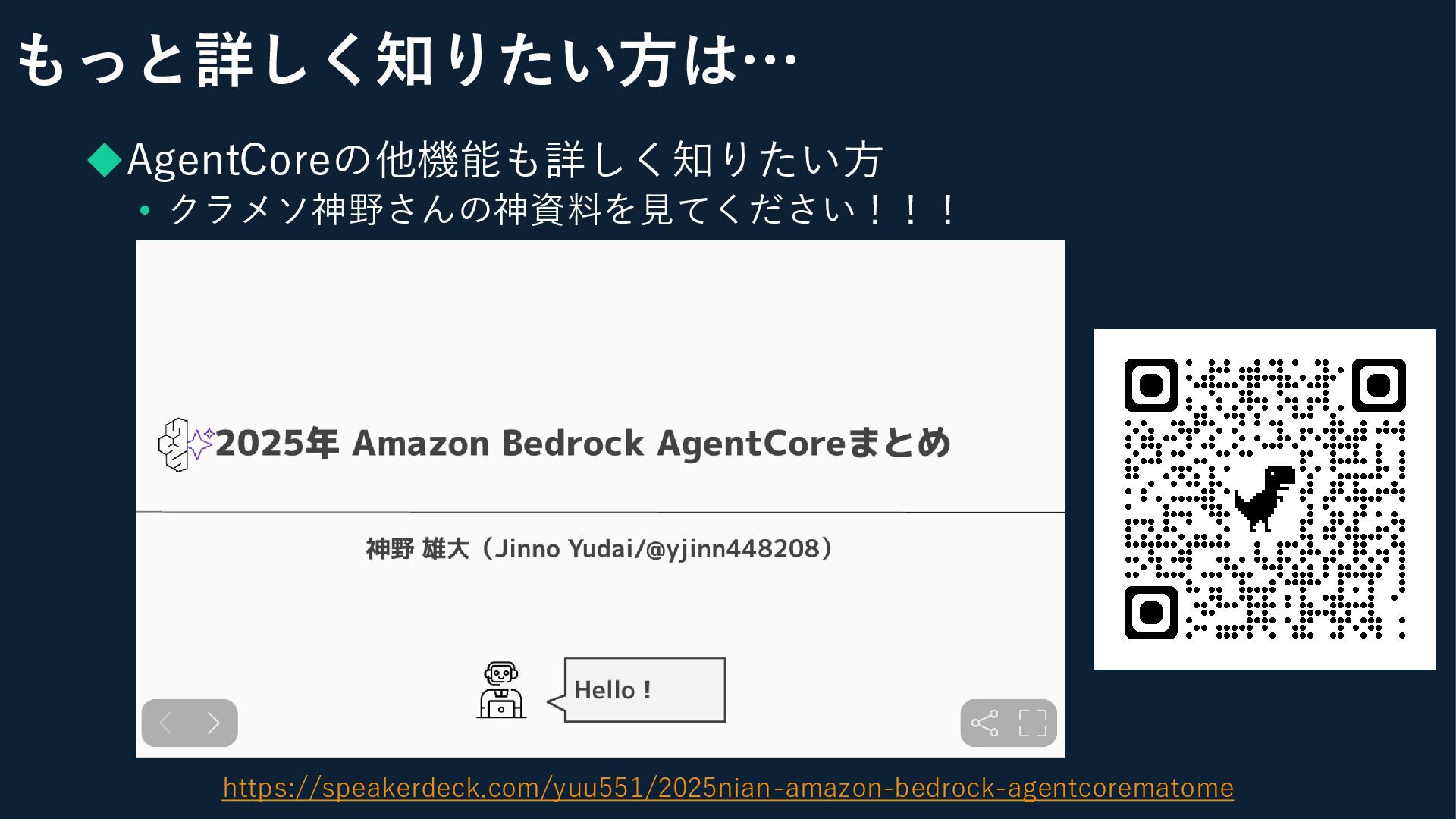 もっと詳しく知りたい方は… ◆AgentCoreの他機能も詳しく知りたい方 • クラメソ神野さんの神資料を見てください!!! https://speakerdeck.com/yuu551/2025nian-amazon-bedrock-agentcorematome