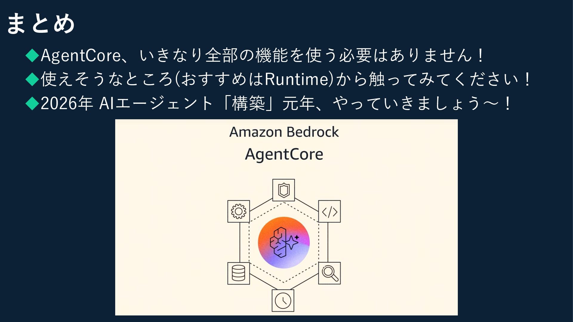 ◆AgentCore、いきなり全部の機能を使う必要はありません! ◆使えそうなところ(おすすめはRuntime)から触ってみてください! ◆2026年 AIエージェント「構築」元年、やっていきましょう〜! まとめ