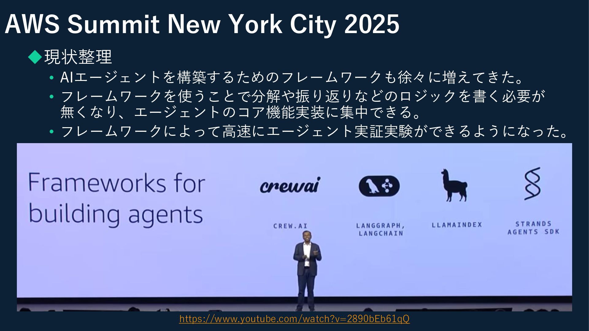 AWS Summit New York City 2025 ◆現状整理 • AIエージェントを構築するためのフレームワークも徐々に増えてきた。 •