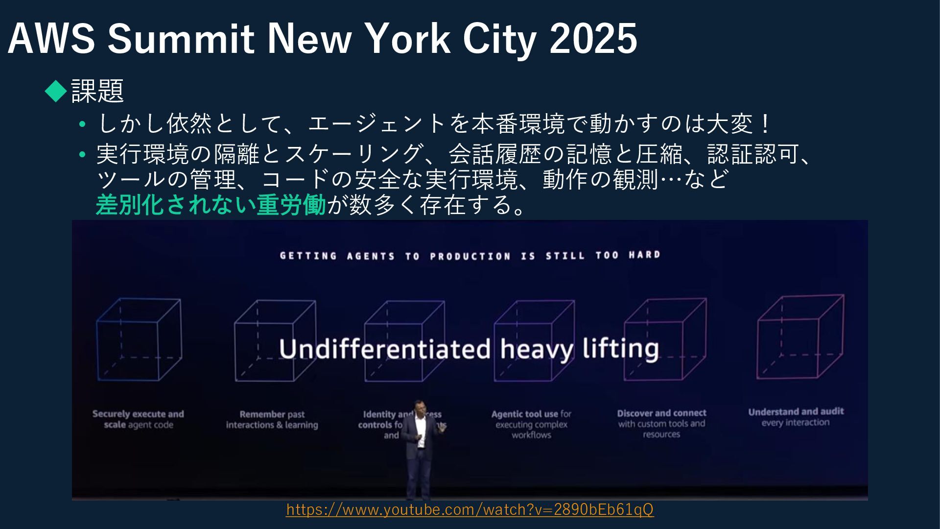 AWS Summit New York City 2025 ◆課題 • しかし依然として、エージェントを本番環境で動かすのは大変! •