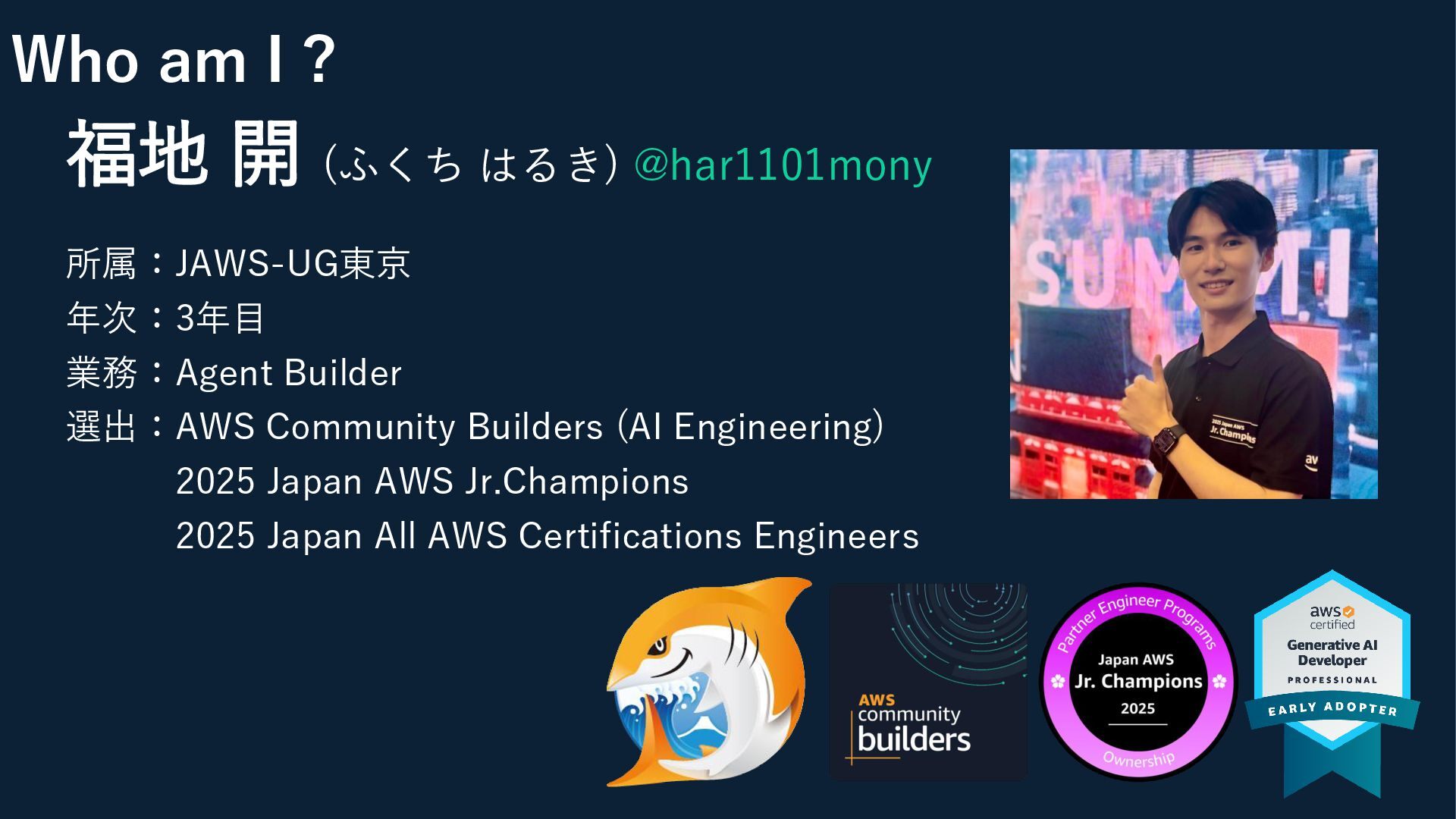 年次:3年目 業務:Agent Builder 選出:AWS Community Builders (AI Engineering) 2025 Japan AWS Jr.Champions 2025 Japan All AWS Certifications Engineers