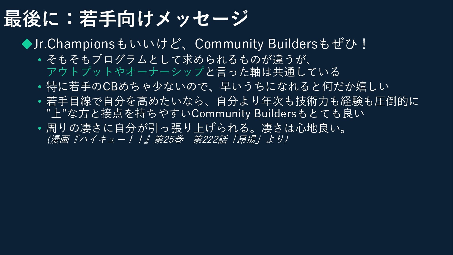 最後に:若手向けメッセージ ◆Jr.Championsもいいけど、Community Buildersもぜひ! • そもそもプログラムとして求められるものが違うが、 アウトプットやオーナーシップと言った軸は共通している • 特に若手のCBめちゃ少ないので、早いうちになれると何だか嬉しい • 若手目線で自分を高めたいなら、自分より年次も技術力も経験も圧倒的に