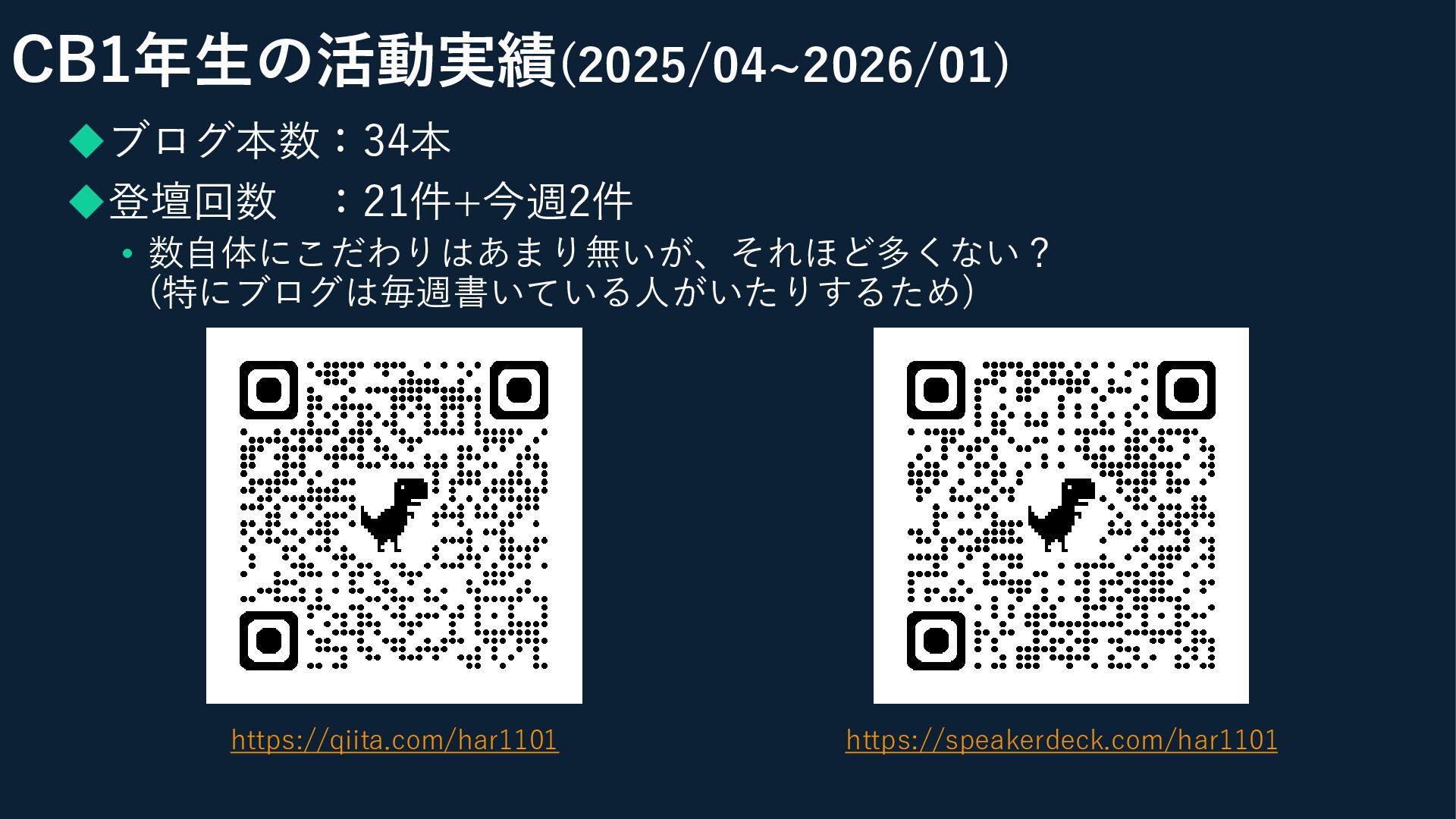 CB1年生の活動実績(2025/04~2026/01) ◆ブログ本数:34本 ◆登壇回数 :21件+今週2件 • 数自体にこだわりはあまり無いが、それほど多くない? (特にブログは毎週書いている人がいたりするため) https://speakerdeck.com/har1101 https://qiita.com/har1101