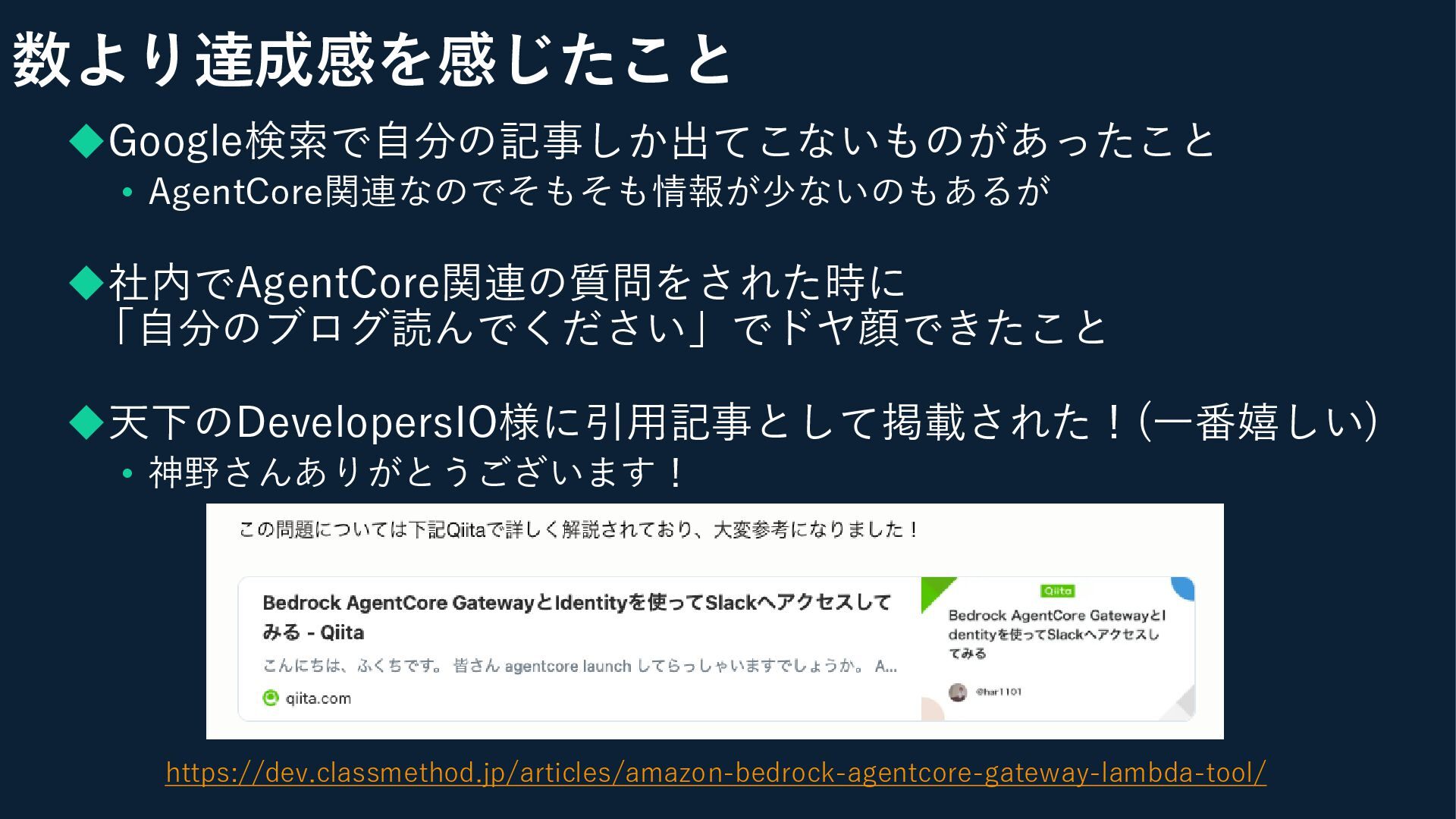 数より達成感を感じたこと ◆Google検索で自分の記事しか出てこないものがあったこと • AgentCore関連なのでそもそも情報が少ないのもあるが ◆社内でAgentCore関連の質問をされた時に 「自分のブログ読んでください」でドヤ顔できたこと ◆天下のDevelopersIO様に引用記事として掲載された!(一番嬉しい) • 神野さんありがとうございます! https://dev.classmethod.jp/articles/amazon-bedrock-agentcore-gateway-lambda-tool/