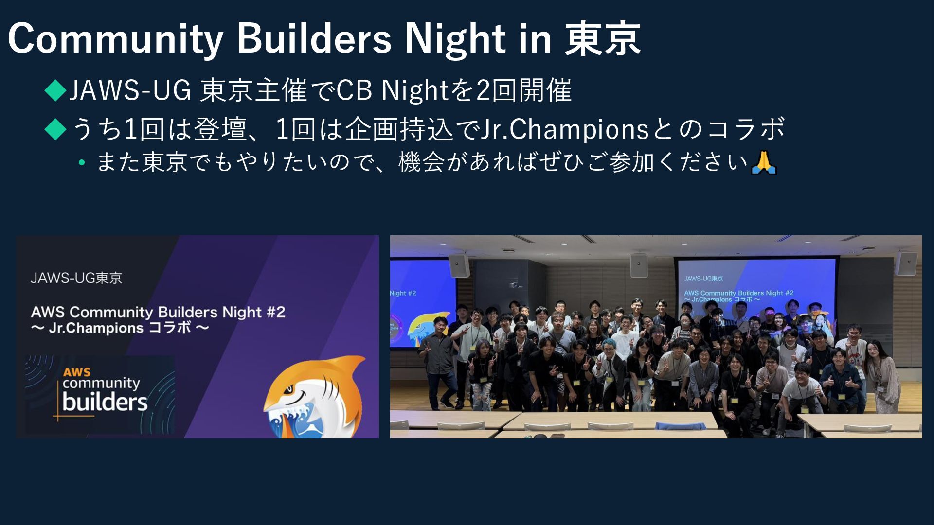 Community Builders Night in 東京 ◆JAWS-UG 東京主催でCB Nightを2回開催 ◆うち1回は登壇、1回は企画持込でJr.Championsとのコラボ •