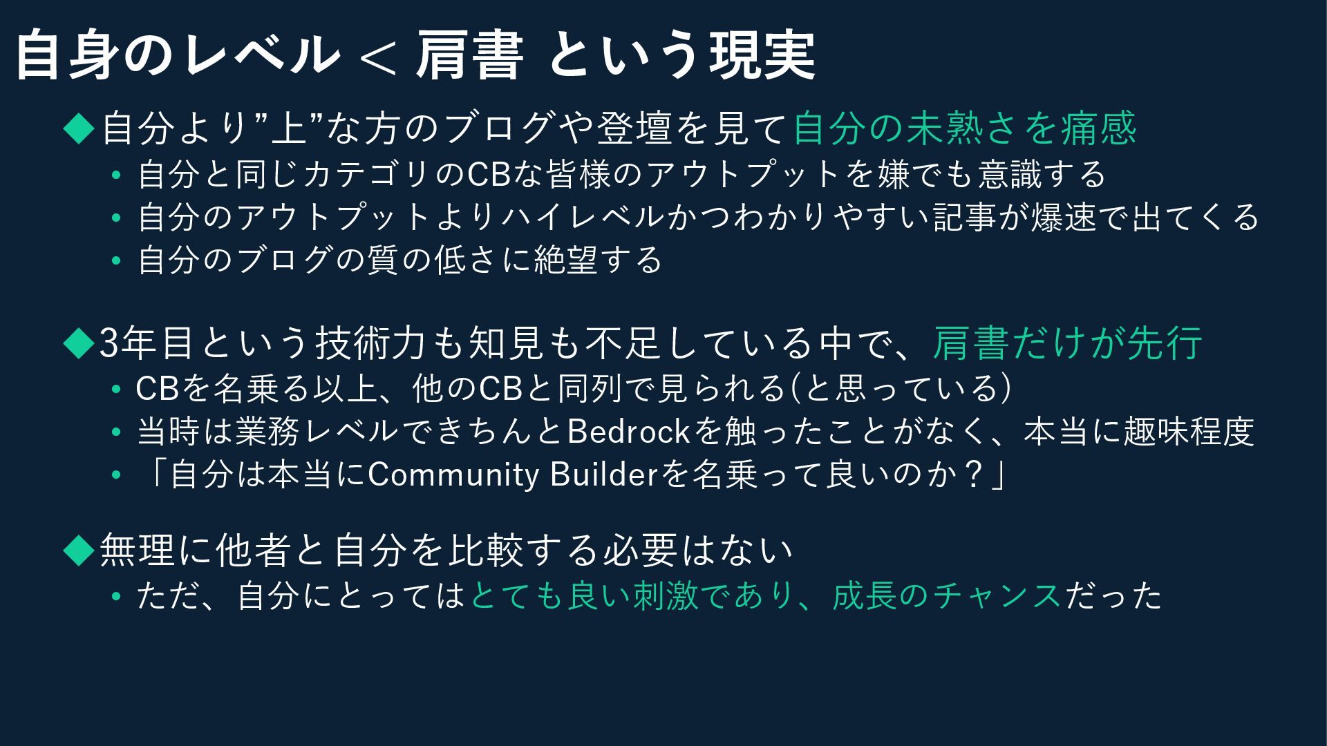 自分のブログの質の低さに絶望する ◆3年目という技術力も知見も不足している中で、肩書だけが先行 • CBを名乗る以上、他のCBと同列で見られる(と思っている) • 当時は業務レベルできちんとBedrockを触ったことがなく、本当に趣味程度 • 「自分は本当にCommunity Builderを名乗って良いのか?」 ◆無理に他者と自分を比較する必要はない • ただ、自分にとってはとても良い刺激であり、成長のチャンスだった