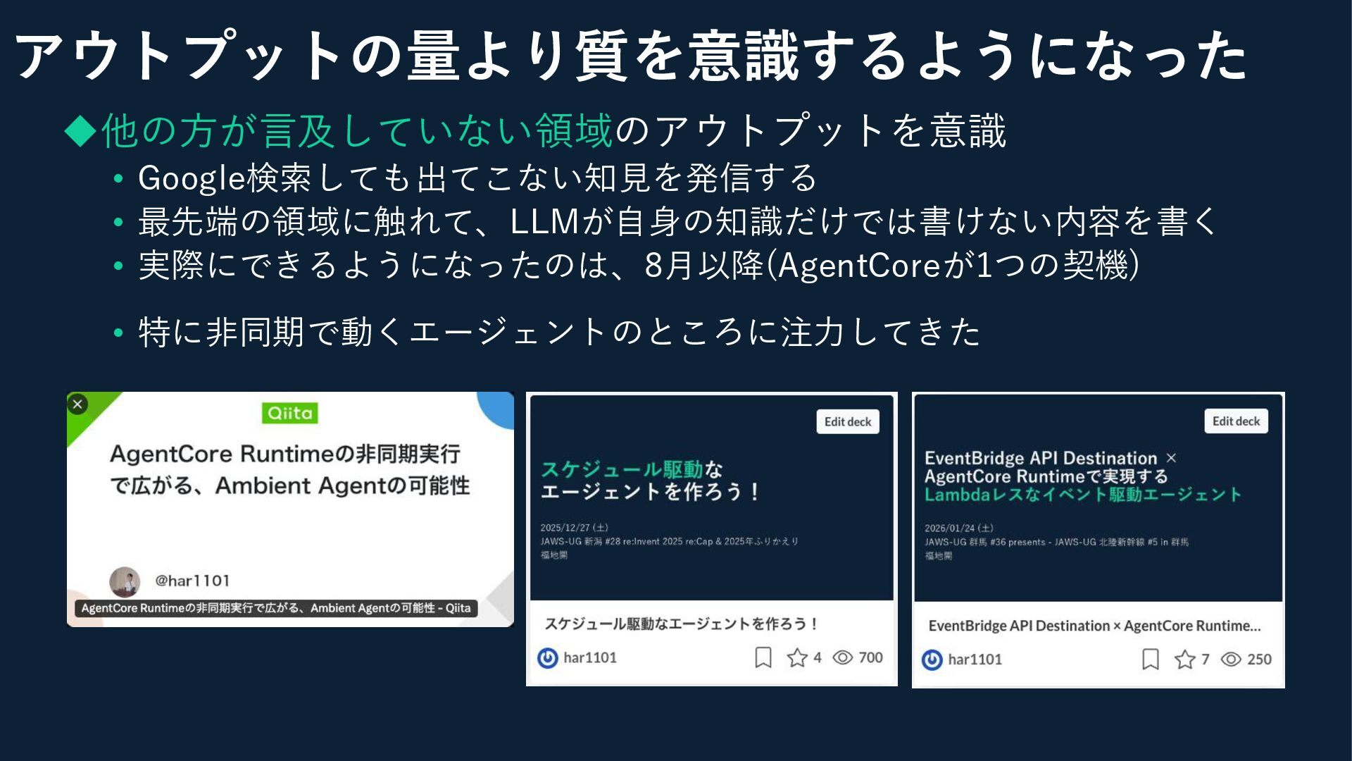 アウトプットの量より質を意識するようになった ◆他の方が言及していない領域のアウトプットを意識 • Google検索しても出てこない知見を発信する • 最先端の領域に触れて、LLMが自身の知識だけでは書けない内容を書く • 実際にできるようになったのは、8月以降(AgentCoreが1つの契機) • 特に非同期で動くエージェントのところに注力してきた