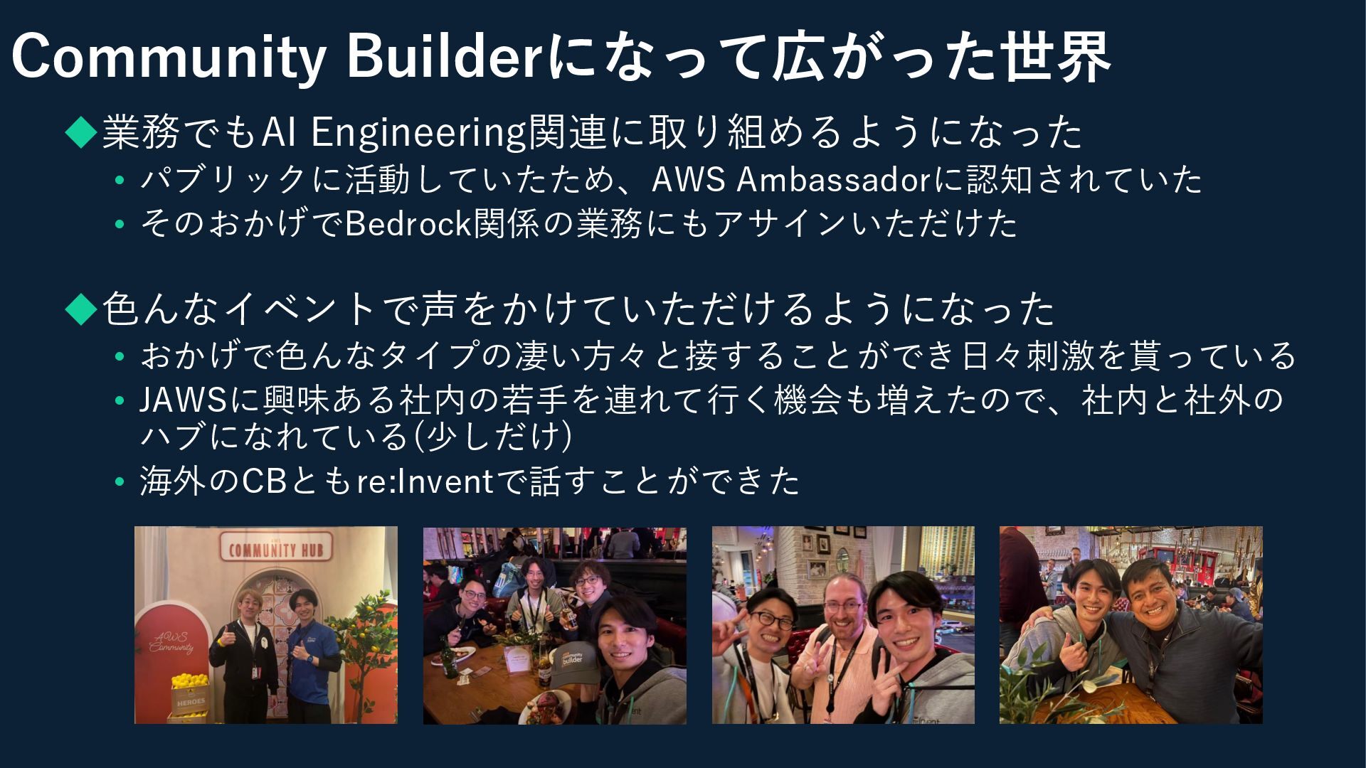 Community Builderになって広がった世界 ◆業務でもAI Engineering関連に取り組めるようになった • パブリックに活動していたため、AWS Ambassadorに認知されていた • そのおかげでBedrock関係の業務にもアサインいただけた ◆色んなイベントで声をかけていただけるようになった