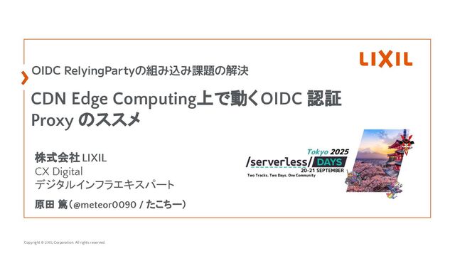 認証 Proxy のススメ 株式会社LIXIL CX Digital デジタルインフラエキスパート 原田 篤(@meteor0090 / たこちー) OIDC RelyingPartyの組み込み課題の解決 2025/9/20 ServerlessDays Tokyo 2025