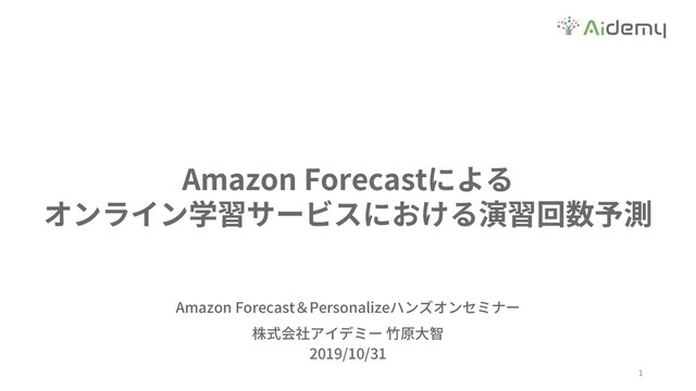 Amazon Forecastによる オンライン学習サービスにおける演習回数予測 1 Amazon Forecast&Personalizeハンズオンセミナー 株式会社アイデミー ⽵原⼤智 2019/10/31