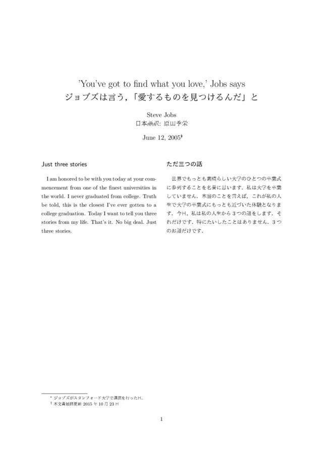 ʮѪ͢ΔͷΛݟ͚ͭΔΜͩʯͱ Steve Jobs ຊޠ༁: ݪాقӫ June 12, 2005∗ † Just three stories I am honored to be with you today at your com- mencement from one of the finest universities in the world. I never graduated from college. Truth be told, this is the closest I’ve ever gotten to a college graduation. Today I want to tell you three stories from my life. That’s it. No big deal. Just three stories. ∗ δϣϒζ͕ελϯϑΥʔυେֶͰߨԋΛߦͬͨɽ † ຊจॻ࠷ऴߋ৽ 2015 10 ݄ 23 ͨͩࡾͭͷ ੈքͰͬͱૉΒ͍͠େֶͷͻͱͭͷଔۀࣜ ʹࢀྻ͢Δ͜ͱΛ໊༪ʹࢥ͍·͢ɽࢲେֶΛଔۀ ͍ͯ͠·ͤΜɽຊͷ͜ͱΛݴ͑ɼ͜Ε͕ࢲͷਓ ੜͰେֶͷଔۀࣜʹͬͱ͍ۙͮͨମݧͱͳΓ· ͢ɽࠓɼࢲࢲͷਓੜ͔Β 3 ͭͷΛ͠·͢ɽͦ Ε͚ͩͰ͢ɽಛʹ͍ͨͨ͜͠ͱ͋Γ·ͤΜɽ3 ͭ ͷ͓͚ͩͰ͢ɽ 1