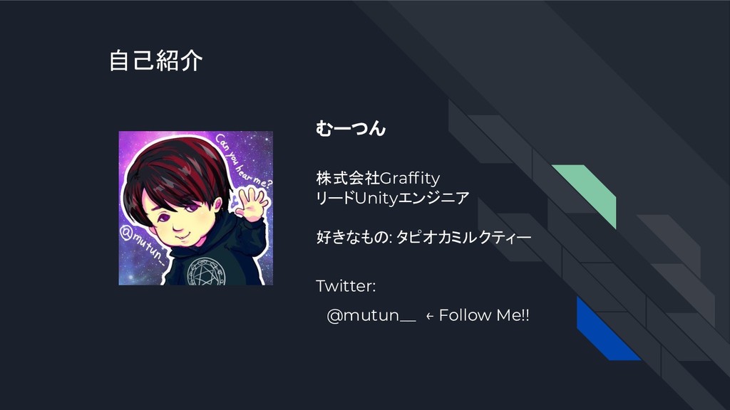 自己紹介 むーつん 株式会社Graffity リードUnityエンジニア 好きなもの: タピオカミルクティー Twitter: @mutun__ ← Follow