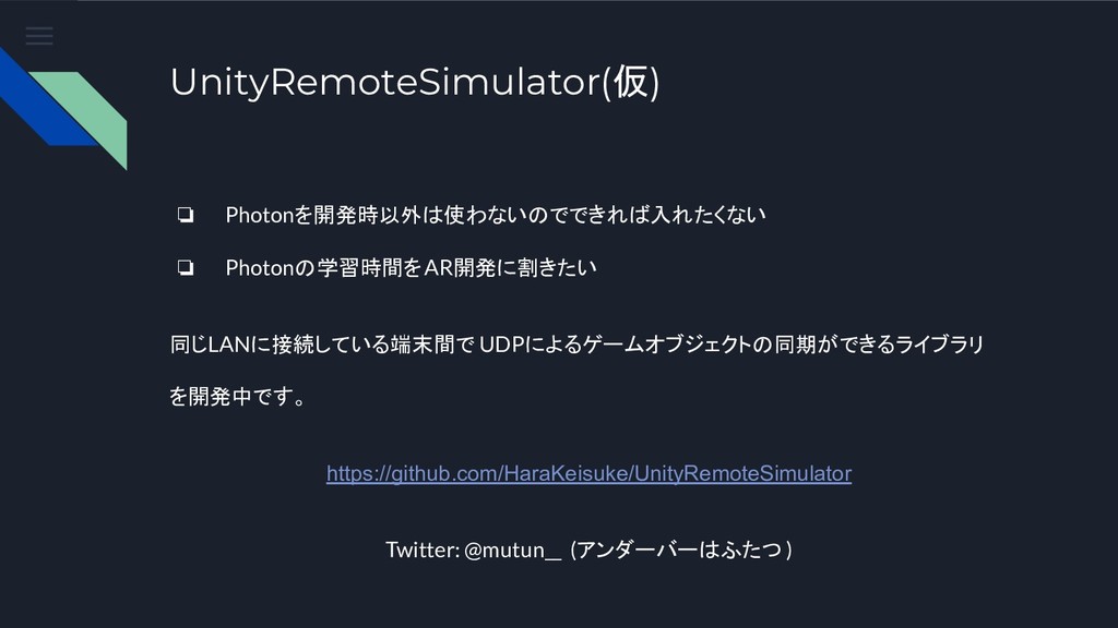 UnityRemoteSimulator(仮) ❏ Photonを開発時以外は使わないのでできれば入れたくない ❏ Photonの学習時間をAR開発に割きたい 同じLANに接続している端末間で UDPによるゲームオブジェクトの同期ができるライブラリ を開発中です。 https://github.com/HaraKeisuke/UnityRemoteSimulator Twitter: