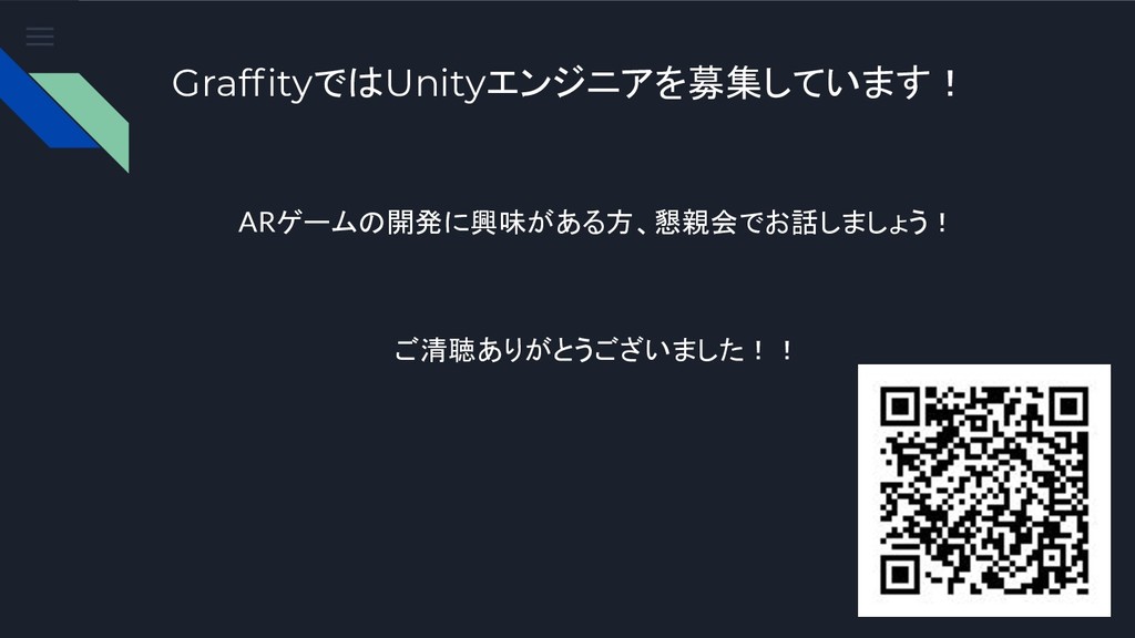 GraffityではUnityエンジニアを募集しています! ARゲームの開発に興味がある方、懇親会でお話しましょう! ご清聴ありがとうございました!!