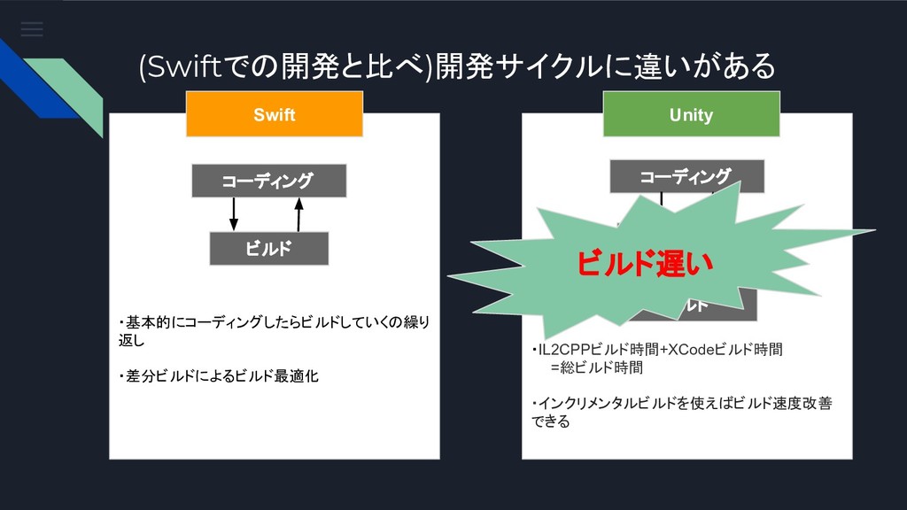 (Swiftでの開発と比べ)開発サイクルに違いがある ・基本的にコーディングしたらビルドしていくの繰り 返し ・差分ビルドによるビルド最適化 Swift ・IL2CPPビルド時間+XCodeビルド時間 =総ビルド時間 ・インクリメンタルビルドを使えばビルド速度改善 できる Unity