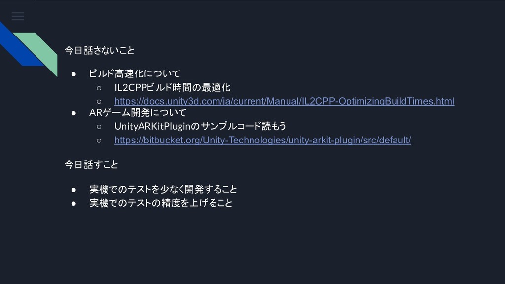 今日話さないこと • ビルド高速化について ◦ IL2CPPビルド時間の最適化 ◦ https://docs.unity3d.com/ja/current/Manual/IL2CPP-OptimizingBuildTimes.html • ARゲーム開発について ◦