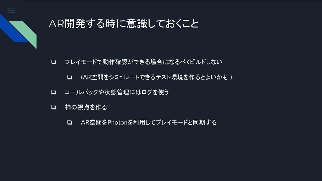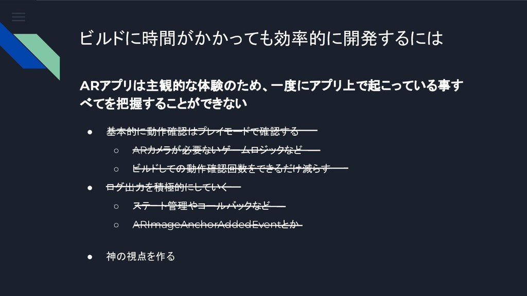 AR開発する時に意識しておくこと ❏ プレイモードで動作確認ができる場合はなるべくビルドしない ❏ (AR空間をシミュレートできるテスト環境を作るとよいかも ) ❏ コールバックや状態管理にはログを使う ❏ 神の視点を作る