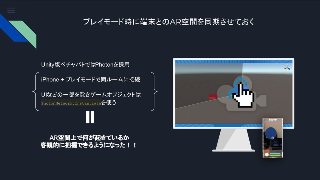 プレイモード時に端末とのAR空間を同期させておく Unity版ペチャバトではPhotonを採用 iPhone + プレイモードで同ルームに接続 UIなどの一部を除きゲームオブジェクトは PhotonNetwork.Instantiateを使う AR空間上で何が起きているか 客観的に把握できるようになった!!