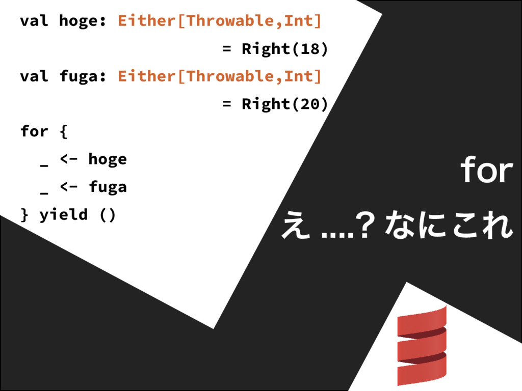 val hoge: Either[Throwable,Int] ɹɹɹɹɹɹɹɹɹɹ= Right(18) val fuga: Either[Throwable,Int] ɹɹɹɹɹɹɹɹɹɹ= Right(20)