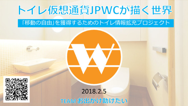 「移動の自由」を保障するトイレ情報の整備に仮想通貨を活用 ロゴ 2018年2月5日発行 初期発行額 10,000JPWC アセットタイプ仮想通貨(独自トークン) アセット情報 https://xchain.io/asset/JPWC わたしたちのアクション⑤ ~トイレ仮想通貨JPWCの導入