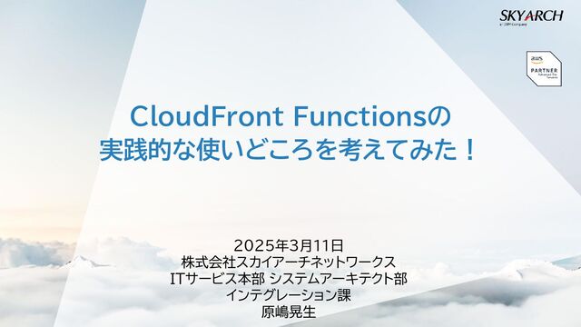 CloudFront Functionsの 実践的な使いどころを考えてみた! 2025年3月11日 株式会社スカイアーチネットワークス ITサービス本部 システムアーキテクト部 インテグレーション課 原嶋晃生