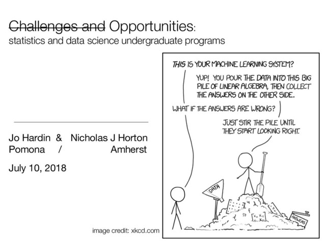 for Undergraduate Statistics Programs, www.amstat.org/asa/education/Curriculum-Guidelinesfor-Undergraduate-Programs-in-StatisticalScience.aspx. • ASA/MAA Guidelines. (2014). ASA/MAA develop guidelines for teaching introductory statistics course, https://magazine.amstat.org/blog/2014/04/01/asamaaguidelines. • Baumer B.S., Cetinkaya-Rundel M., Bray A., Loi L. and Horton N.J. (2014). R Markdown: integrating a reproducible analysis tool into introductory statistics, Technology Innovations in Statistics Education, 8(1). • Baumer, B.S., Kaplan, D. T., and Horton, N.J. (2017). Modern Data Science with R, Boca Raton, FL: CRC Press, http://mdsr-book.github.io. • Bryan, J. (2018). Excuse me, do you have a moment to talk about version control? The American Statistician, Vol 72 (1) 20-27. • Çetinkaya-Rundel and Rundel, C. (2018). Infrastructure and tools for teaching computing throughout the statistical curriculum, The American Statistician, Vol 72 (1), 58-65. • Chambers, J.M. (1993). Greater or lesser statistics, Statistics and Computing, 3(4):182-184. • Committee on Applied and Theoretical Statistics, National Research Council (1994). Modern Interdisciplinary University Statistics Education: Proceedings of a Symposium. http://www.nap.edu/catalog/2355.html. • Committee on Envisioning the Data Science Discipline: The Undergraduate Perspective: Interim Report (2017). Washington, DC: National Academies Press, https://www.nap.edu/catalog/24886/envisioning-the-data-science-discipline-the-undergraduate-perspective-interim-report. • De Veaux, R.D., et al. (2017). Curriculum guidelines for undergraduate programs in data science, Ann Rev of Statistics and its Applications, DOI:10.1146/annurev-statistics-060116-053930. • Donoho, D. 50 years of data science (plus discussion) (2017). JCGS, 26(4):745-756. • Gould, R. (2014). DataFest: celebrating data in the data deluge, ICOTS 9 proceedings. • Horton, N.J., Baumer B.S., and Wickham H. (2015). Setting the stage for data science: integration of data management skills in introductory and second courses in statistics, CHANCE, 28(2):40-50. • Horton, N.J., Brown E.R., and Qian L. (2004). Use of R as a toolbox for mathematical statistics exploration. The American Statistician, 58(4):343-357. • Horton, N.J., and Hardin, J.S. (2017). Ensuring that mathematics is relevant in a world of data science. Notices of the American Mathematical Society, 64(9):986-990, https://www.ams.org/publications/journals/notices/201709/rnoti-p986.pdf • James, G., Witten, D., Hastie, T., and Tibshirani, R. (2013). An Introduction to Statistical Learning: with Applications in R. NY, NY: Springer. • Martinosi, S.E. and Williams, T.D. (2016). A survey of statistical capstones, Journal of Statistics Education, 24(3). • McNamara A., Horton N.J., and Baumer B.S. (2017). Greater data science at baccalaureate institutions, JCGS, 26(4):781-783. • Nolan, D. and Perrett, J. (2016). Teaching and learning data visualization: ideas and assignments, The American Statistician, 70(3):260-269. • O'Neil, C. (2016). Weapons of Math Destruction: How Big Data Increases Inequality & Threatens Democracy. NY, NY: Crown Publishing Group. • Wickham, H., and Grolemund, G. (2017). R for Data Science. Sebastopol, CA: O'Reilly Media, http://r4ds.had.co.nz. References