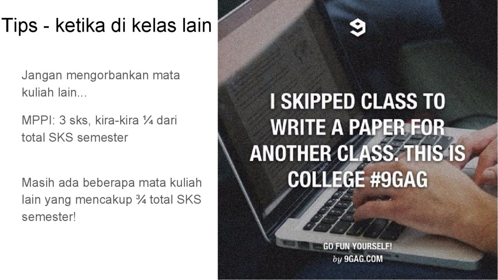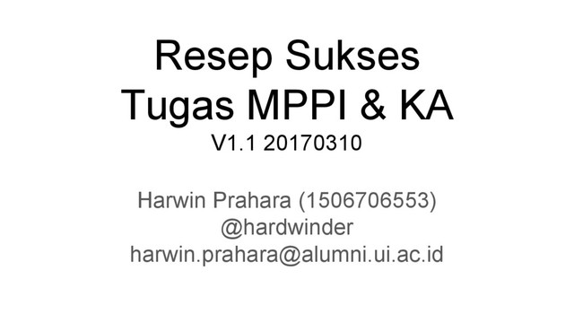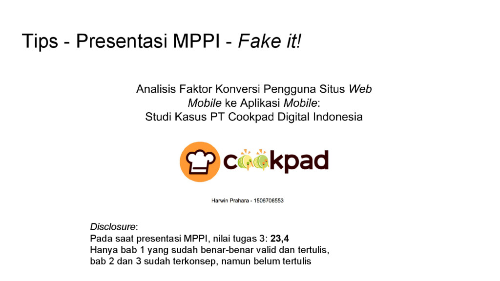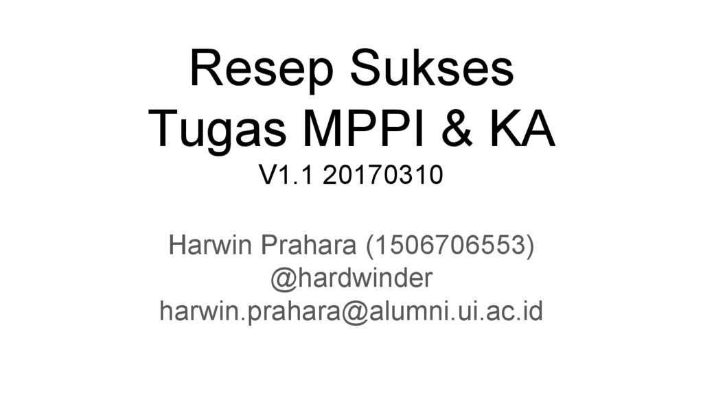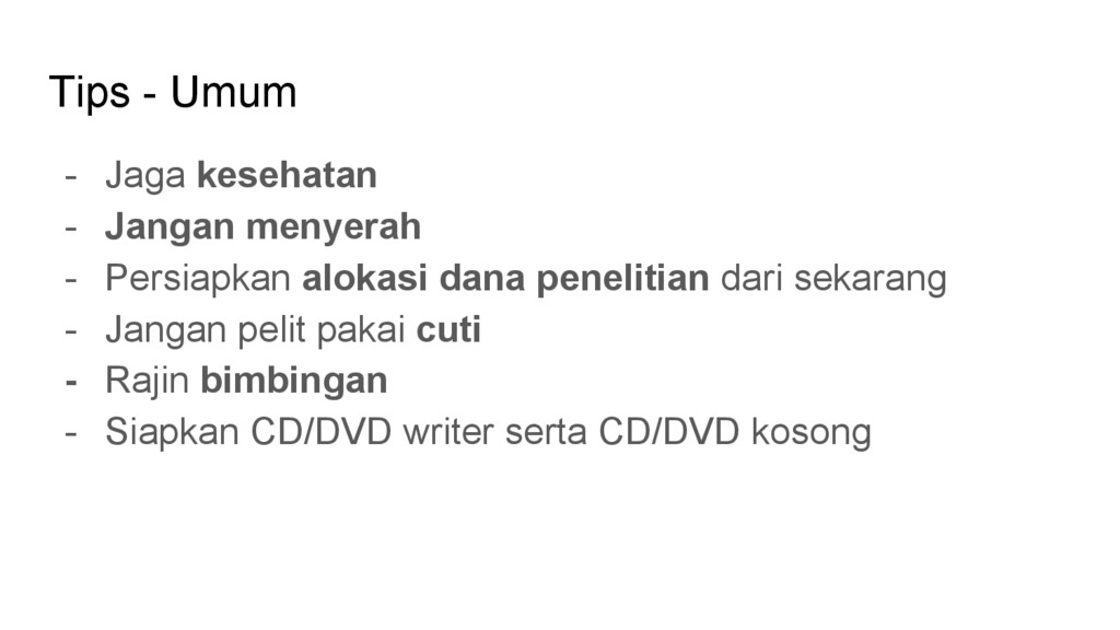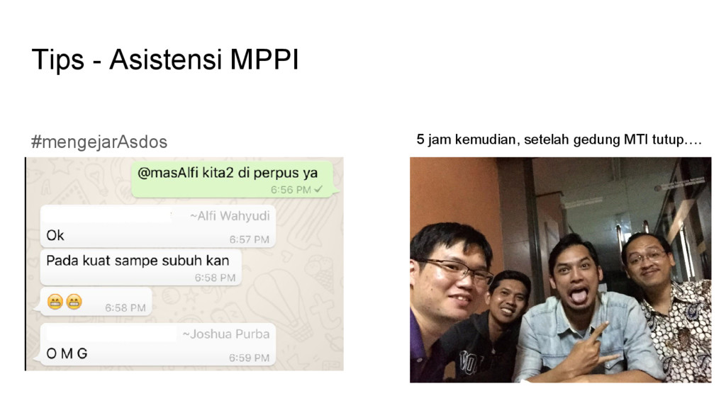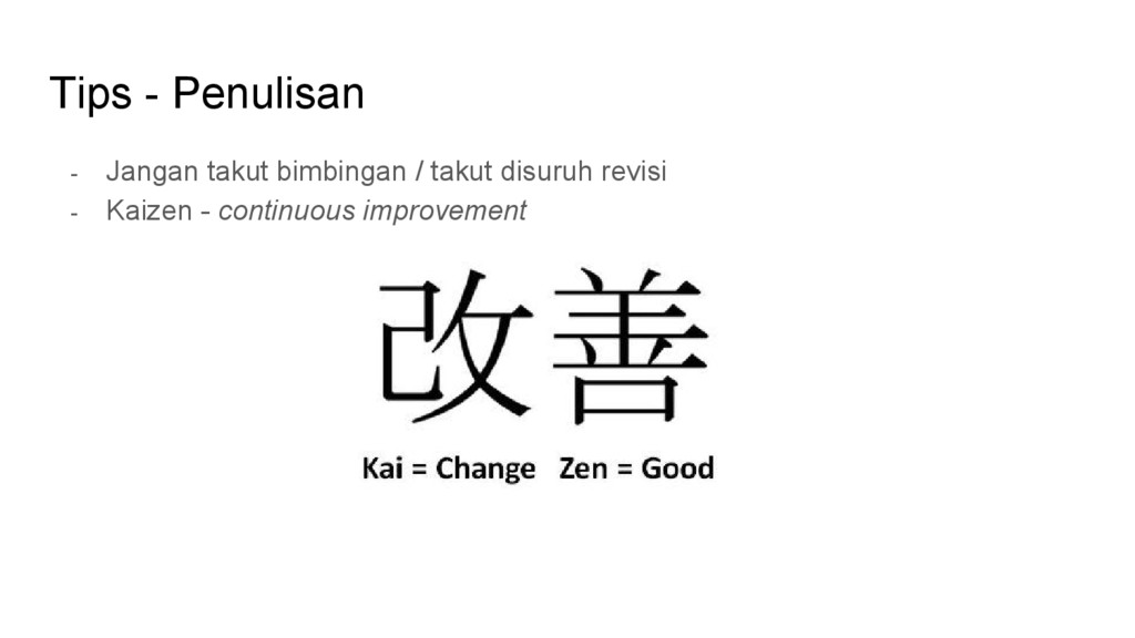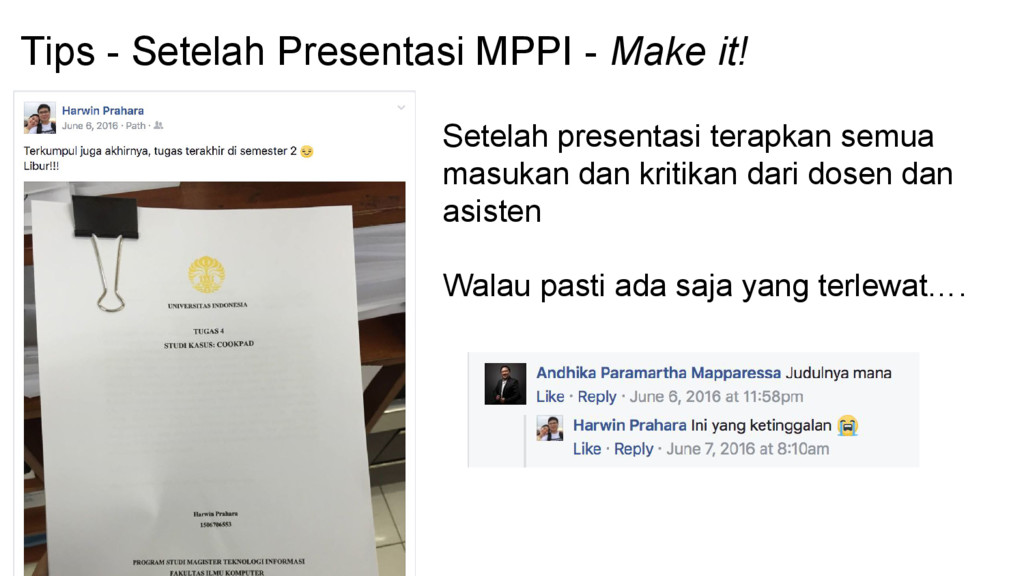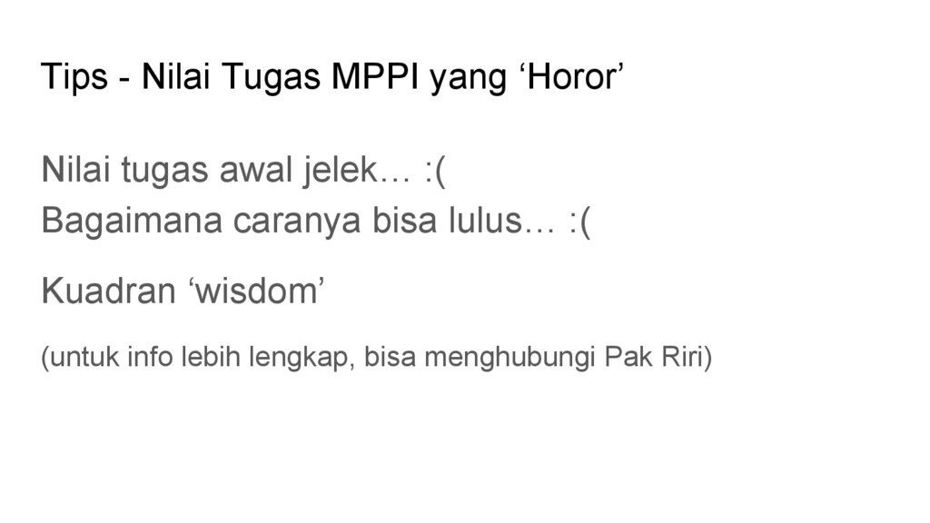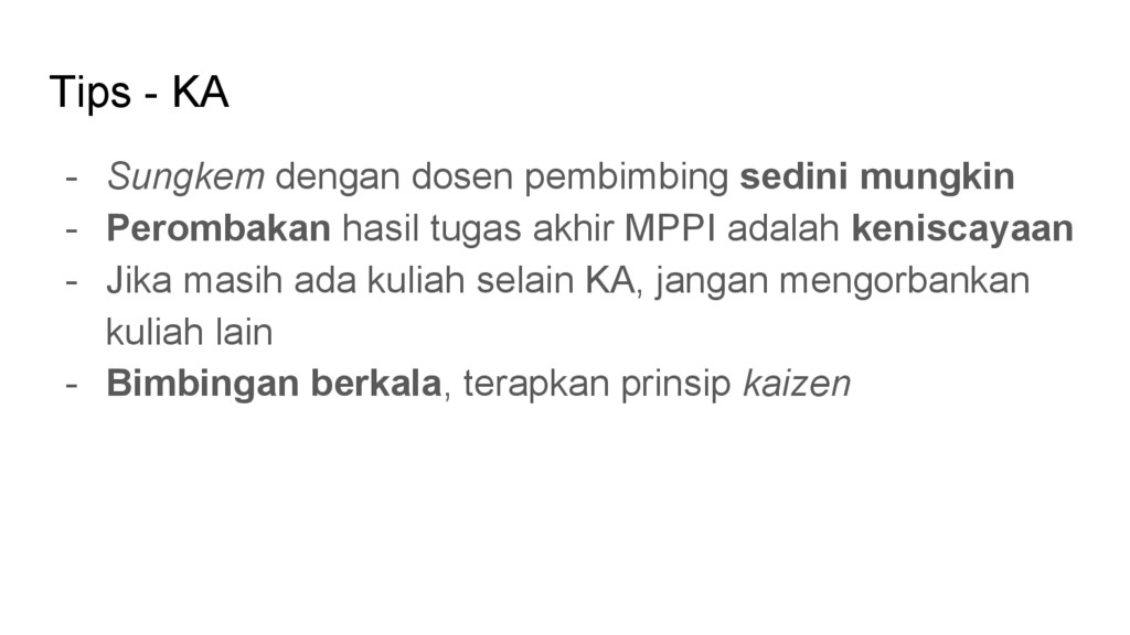- Perombakan hasil tugas akhir MPPI adalah keniscayaan - Jika masih ada kuliah selain KA, jangan mengorbankan kuliah lain - Bimbingan berkala, terapkan prinsip kaizen