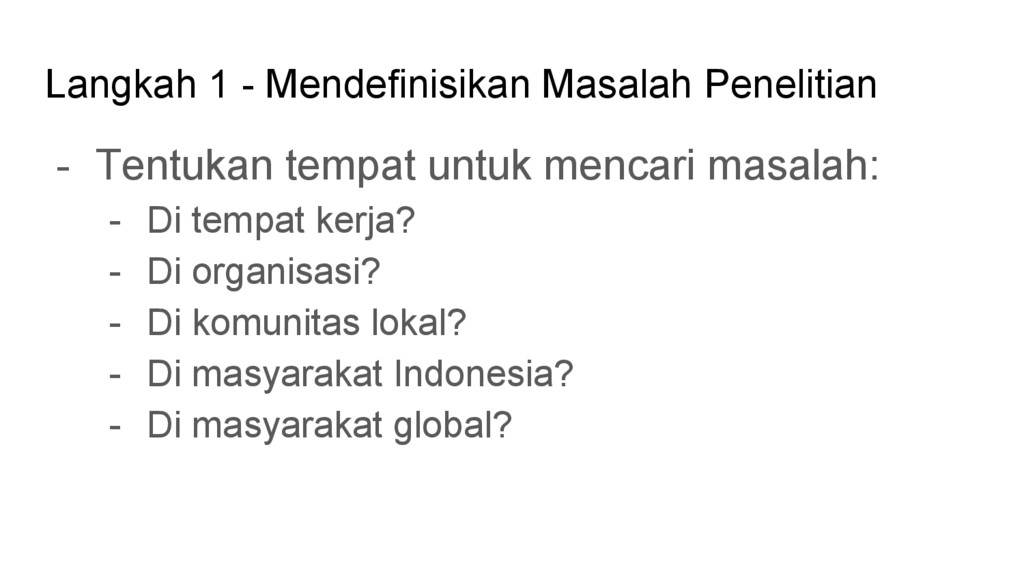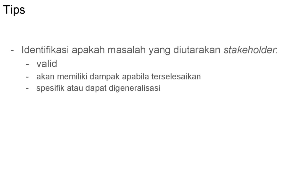 Siapa stakeholder? Bagaimana kondisi saat ini? Apa harapan-harapan yang sudah dicanangkan, namun belum terealisasi? Apakah pernah terjadi hal yang di luar kebiasaan? Mengapa terjadi? Apa yang bisa diperbuat di ‘habitat’ ini? - Jika pertanyaan-pertanyaan seperti di atas sulit dijawab, disarankan untuk mencari ‘habitat’ lain yang lebih jelas Langkah 2 - Identifikasi Permasalahan yang Ada