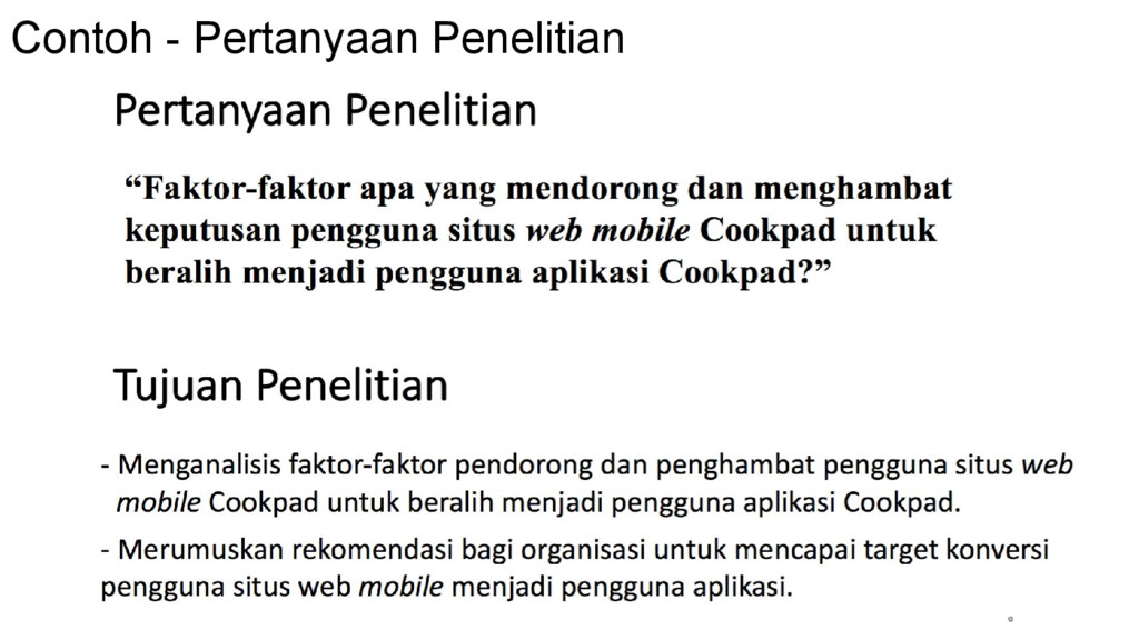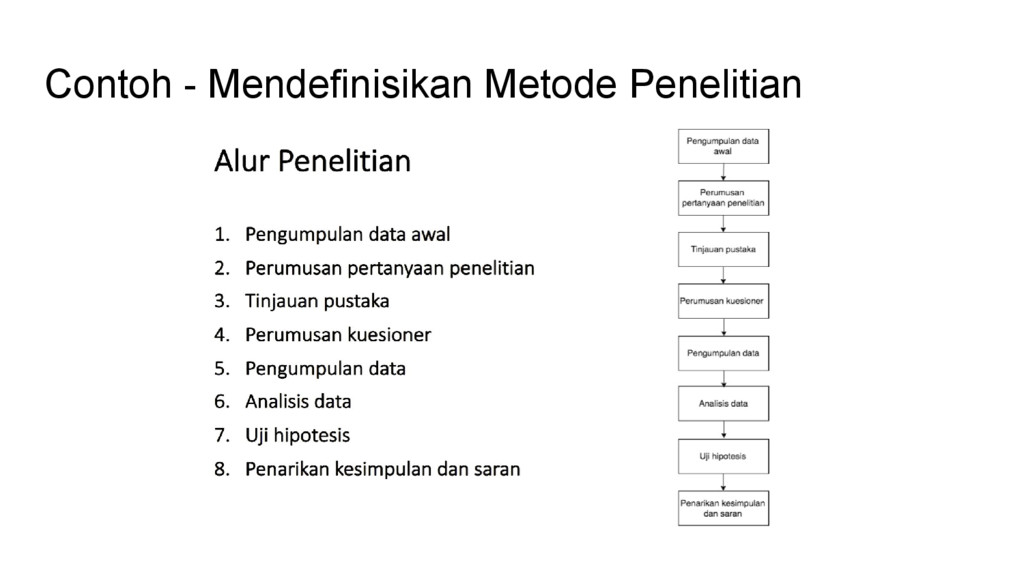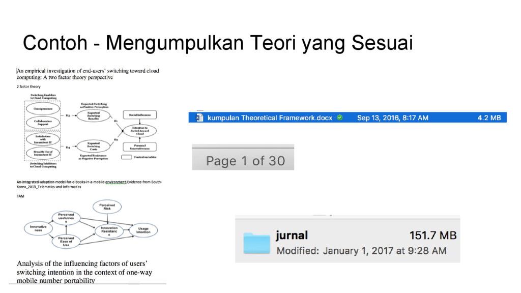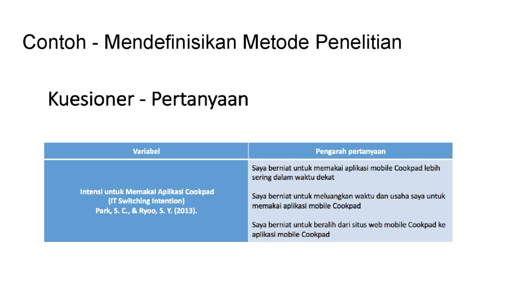 sangat berguna pada tahap ini - Mis. Research Methods for Business, Structural Equation Modeling with AMOS, Partial Least Squares Structural Equation Modeling, dsb. - Sebagai landasan teori untuk menentukan berbagai prosedur dan parameter penelitian - Mis. kualitatif atau kuantitatif, tahapan membuat kuesioner, jumlah sampel, teori pengambilan kesimpulan wawancara, langkah-langkah statistik, dsb - Penentuan indikator pertanyaan untuk wawancara / kuesioner harus ada dasarnya dan dapat dipertanggungjawabkan - Mis. berdasarkan penelitian sebelumnya, hasil FGD dengan expert, dsb