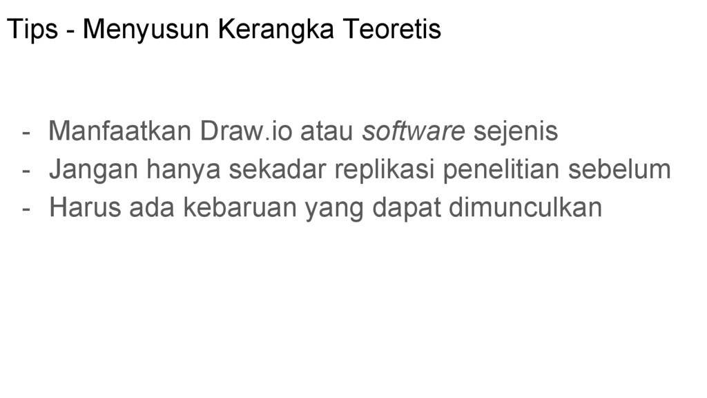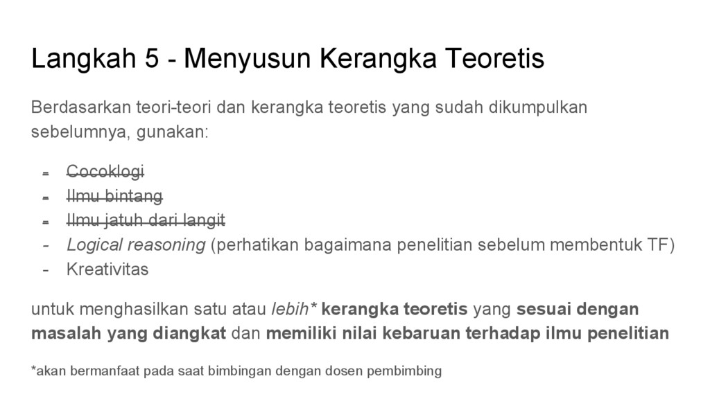 teoretis yang sudah dikumpulkan sebelumnya, gunakan: - Cocoklogi - Ilmu bintang - Ilmu jatuh dari langit - Logical reasoning (perhatikan bagaimana penelitian sebelum membentuk TF) - Kreativitas untuk menghasilkan satu atau lebih* kerangka teoretis yang sesuai dengan masalah yang diangkat dan memiliki nilai kebaruan terhadap ilmu penelitian *akan bermanfaat pada saat bimbingan dengan dosen pembimbing