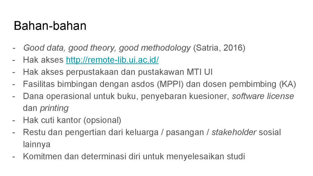 - Hak akses http://remote-lib.ui.ac.id/ - Hak akses perpustakaan dan pustakawan MTI UI - Fasilitas bimbingan dengan asdos (MPPI) dan dosen pembimbing (KA) - Dana operasional untuk buku, penyebaran kuesioner, software license dan printing - Hak cuti kantor (opsional) - Restu dan pengertian dari keluarga / pasangan / stakeholder sosial lainnya - Komitmen dan determinasi diri untuk menyelesaikan studi