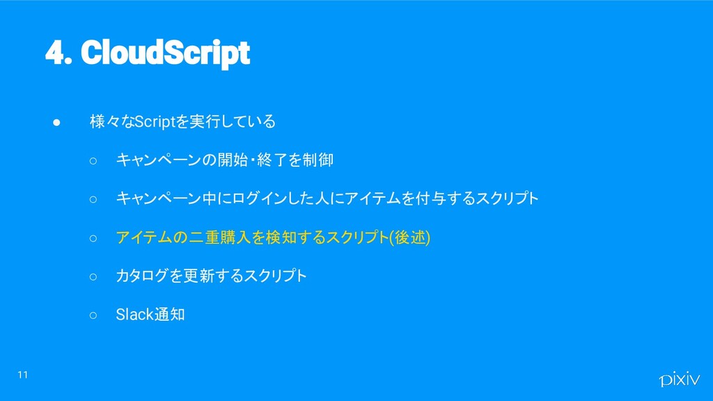 11 • 様々なScriptを実行している ◦ キャンペーンの開始・終了を制御 ◦ キャンペーン中にログインした人にアイテムを付与するスクリプト ◦ アイテムの二重購入を検知するスクリプト (後述)