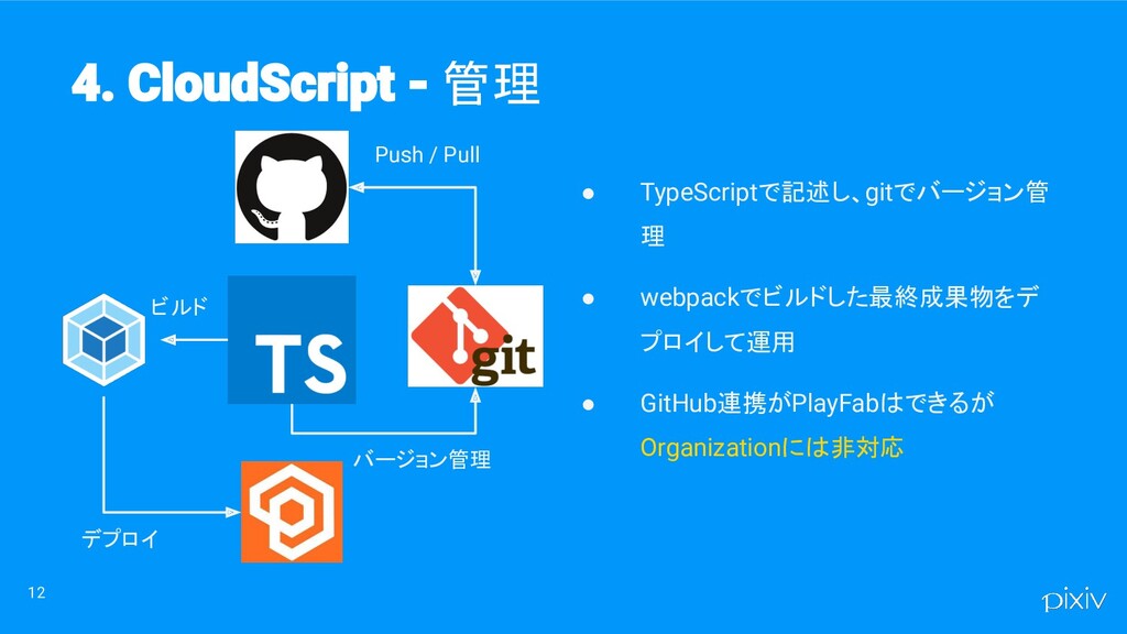12 • TypeScriptで記述し、gitでバージョン管 理 • webpackでビルドした最終成果物をデ プロイして運用 • GitHub連携がPlayFabはできるが Organizationには非対応