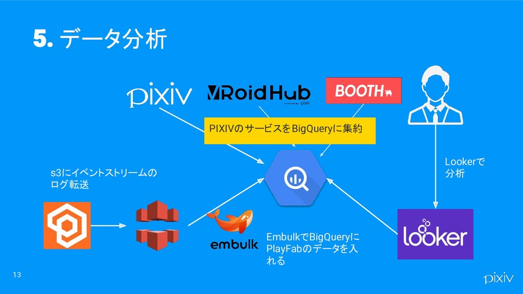 13 データ分析 PIXIVのサービスをBigQueryに集約 s3にイベントストリームの ログ転送 EmbulkでBigQueryに PlayFabのデータを入 れる Lookerで 分析