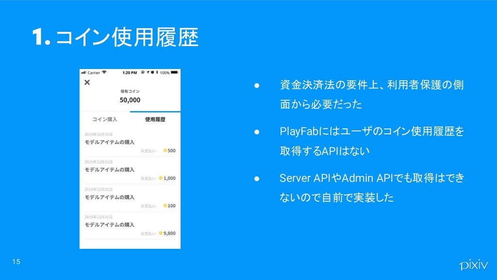 15 • 資金決済法の要件上、利用者保護の側 面から必要だった • PlayFabにはユーザのコイン使用履歴を 取得するAPIはない • Server APIやAdmin