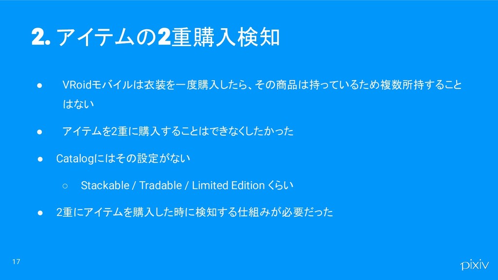 17 • VRoidモバイルは衣装を一度購入したら、その商品は持っているため複数所持すること はない • アイテムを2重に購入することはできなくしたかった • Catalogにはその設定がない ◦ Stackable