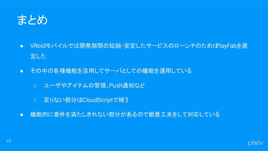 19 • VRoidモバイルでは開発期間の短縮・安定したサービスのローンチのために PlayFabを選 定した • その中の各種機能を活用してサーバとしての機能を運用している ◦ ユーザやアイテムの管理、Push通知など ◦