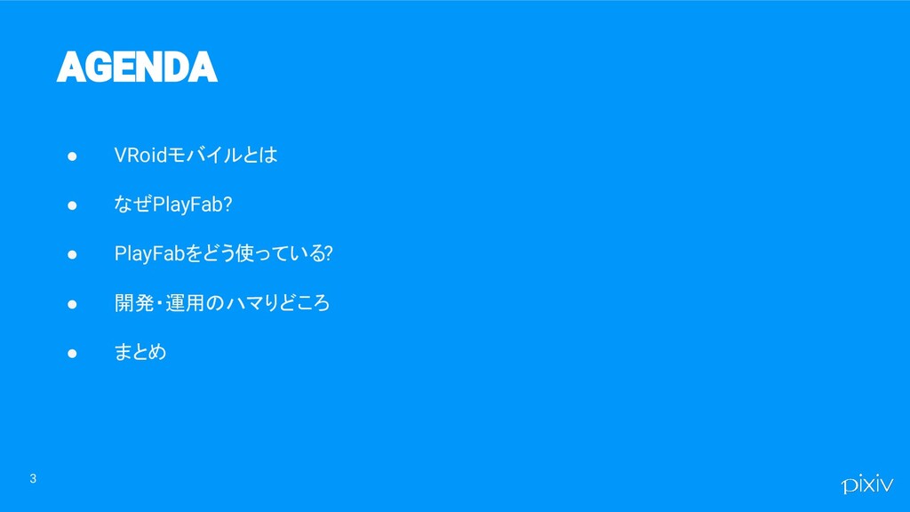 3 • VRoidモバイルとは • なぜPlayFab? • PlayFabをどう使っている? • 開発・運用のハマりどころ •