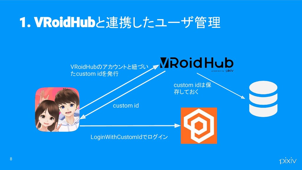 8 と連携したユーザ管理 VRoidHubのアカウントと紐づい たcustom idを発行 custom idは保 存しておく LoginWithCustomIdでログイン custom