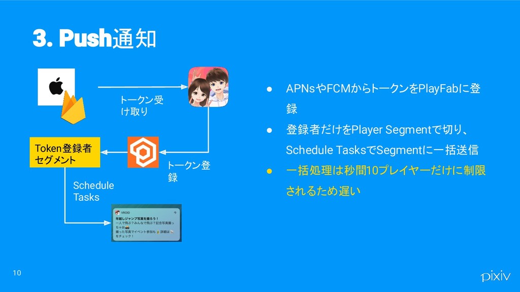 • APNsやFCMからトークンをPlayFabに登 録 • 登録者だけをPlayer Segmentで切り、 Schedule TasksでSegmentに一括送信 • 一括処理は秒間10プレイヤーだけに制限